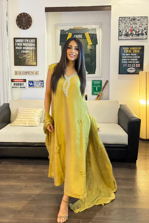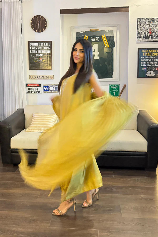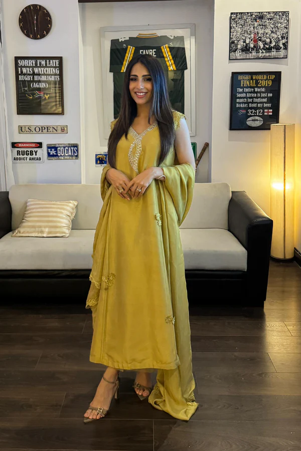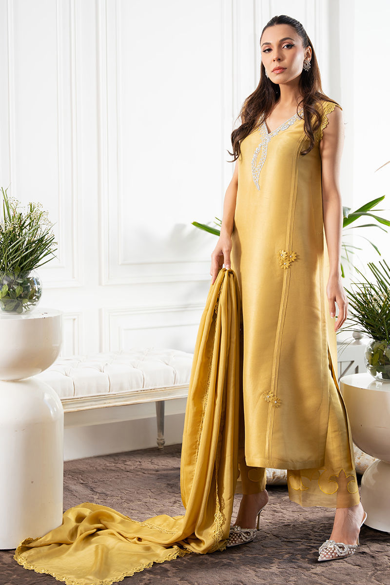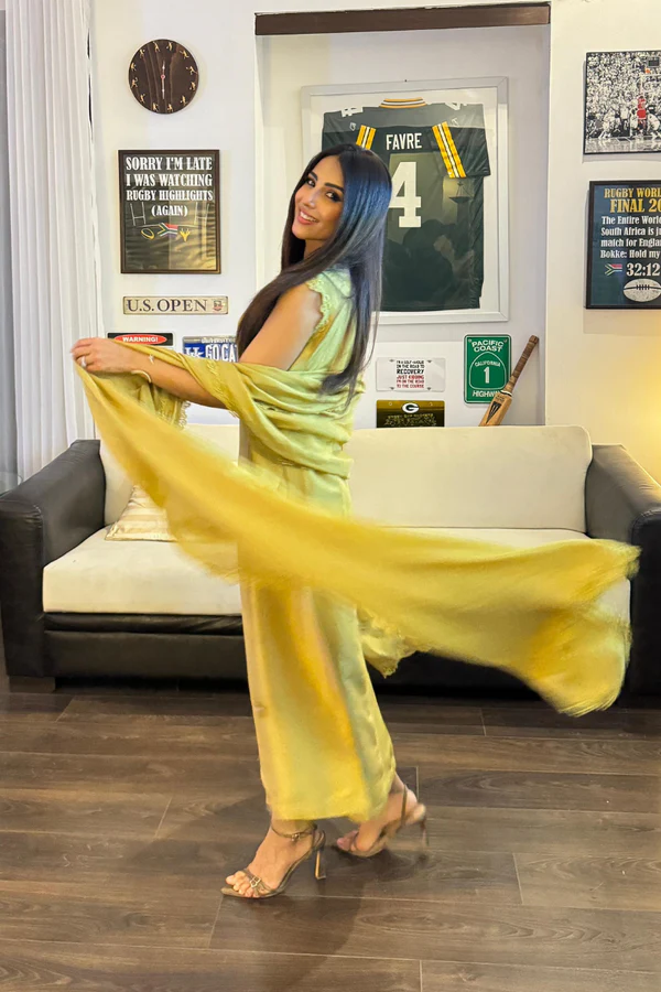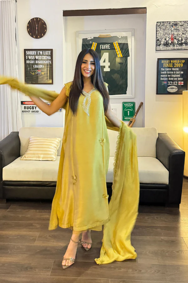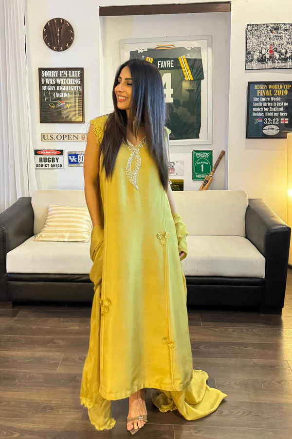 Pure raw silk kiwi lime shirt is a true stellar with neckline encrusted with Swarovski crystals, dabka and stones. Fabric flower and pleats is all about attention to detail.