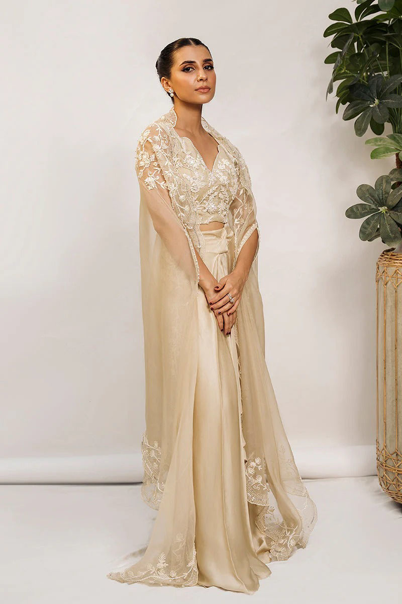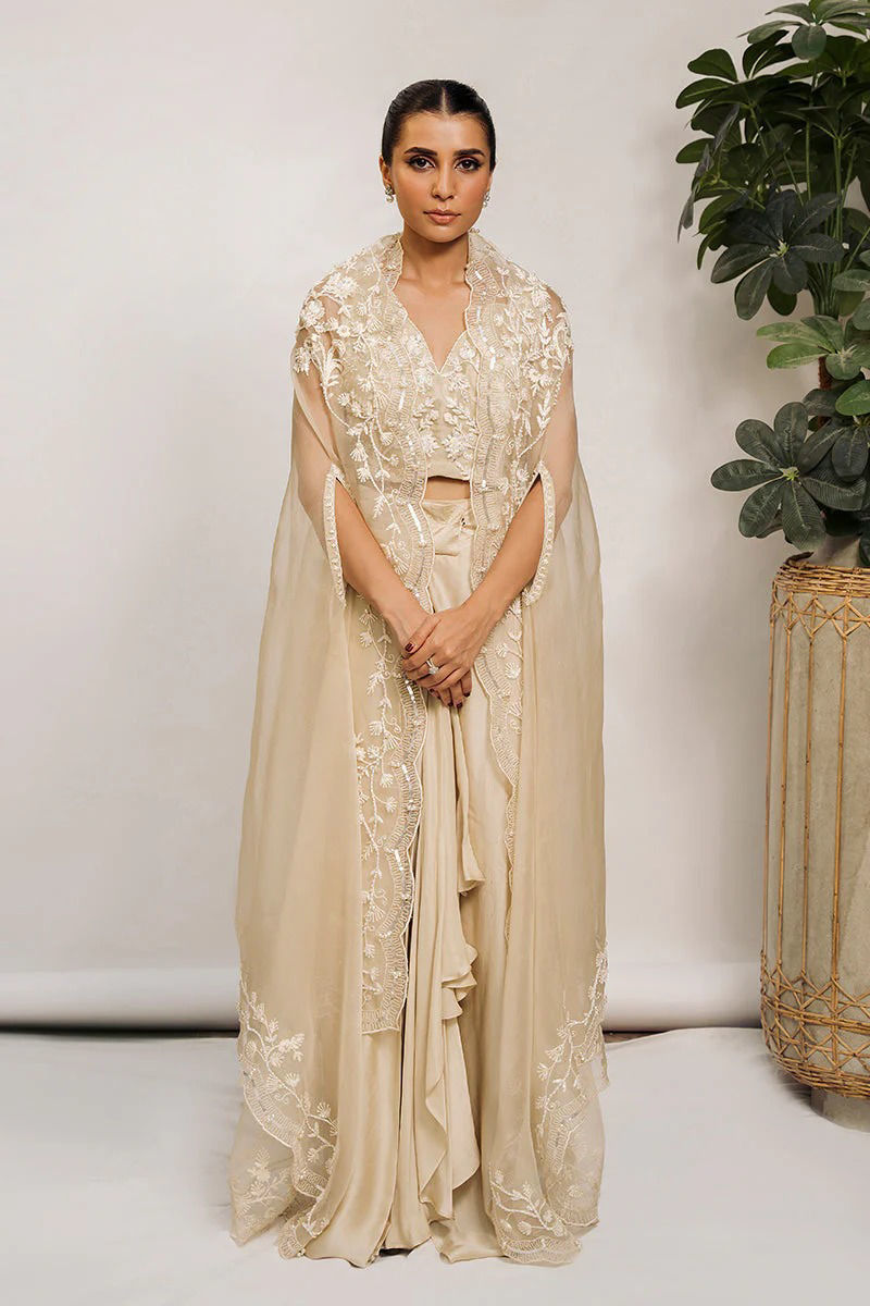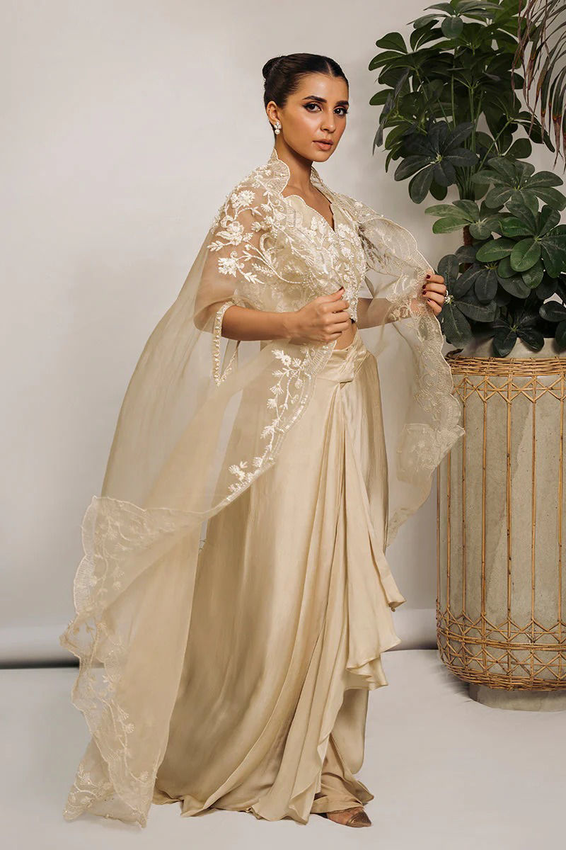 we are in love with this vanilla shade. Understated yet fully worked ( thread-work, sequence, Cutdana) organza cape jacket. Scalloped neckline choli catches the attention with its intricate worked anchor and hand worked jaal. Dhoti skirt in bengali chemeuse gives a modern twist to the whole look. Wedding brunches and soirées just got sorted.
