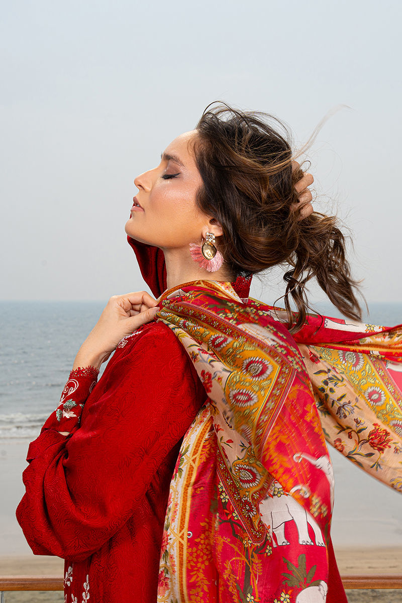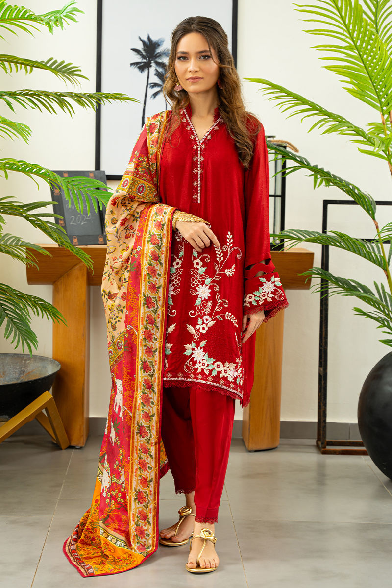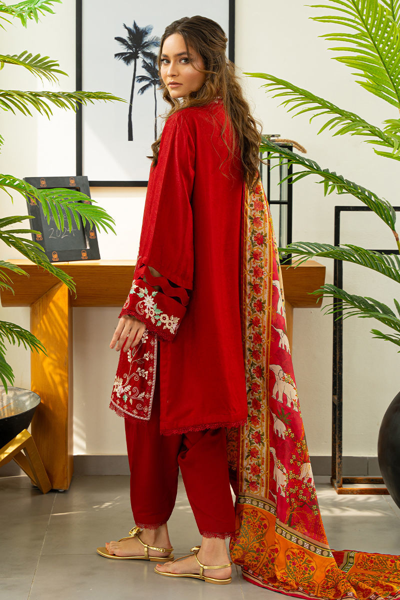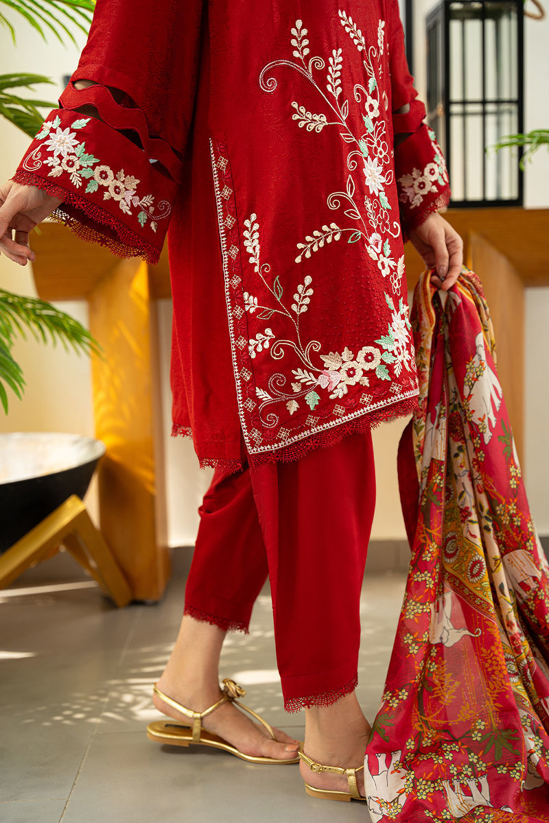 Deep cherry red inhouse embosed silk short shirt catches our eye. stunning embroideries on daaman, chaak, sleeves and neckline with amalgamation of zari. laces detailing and cutwork on sleeves brings out the whole ensemble. skinny shalwar is on silk. our curated printed dupatta with mughal floral prints in complementing colours is a true stellar.Shirt: In-House Embossed SilkDupatta: Medium SilkShalwar: In-House Embossed Silk