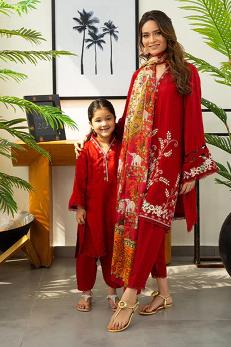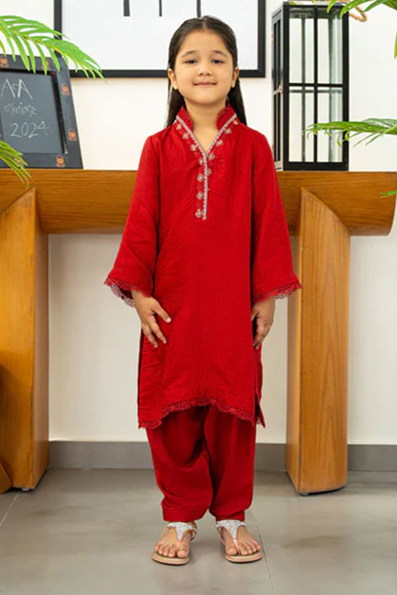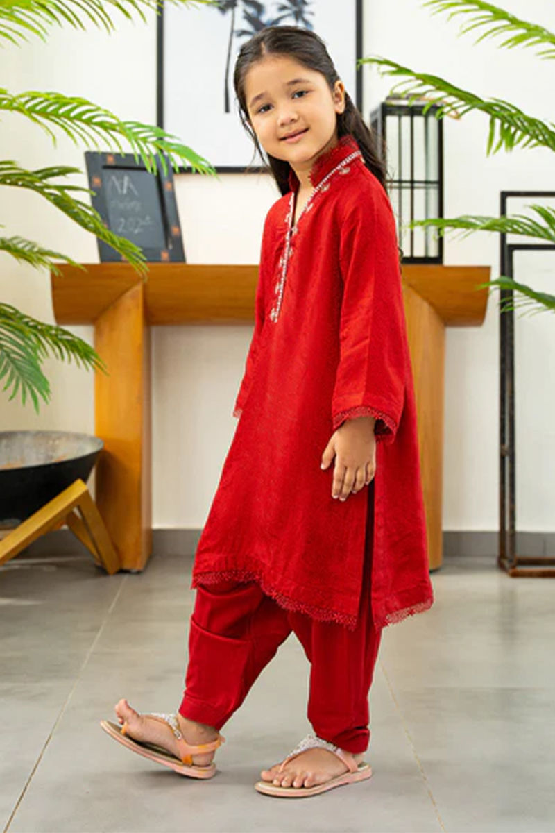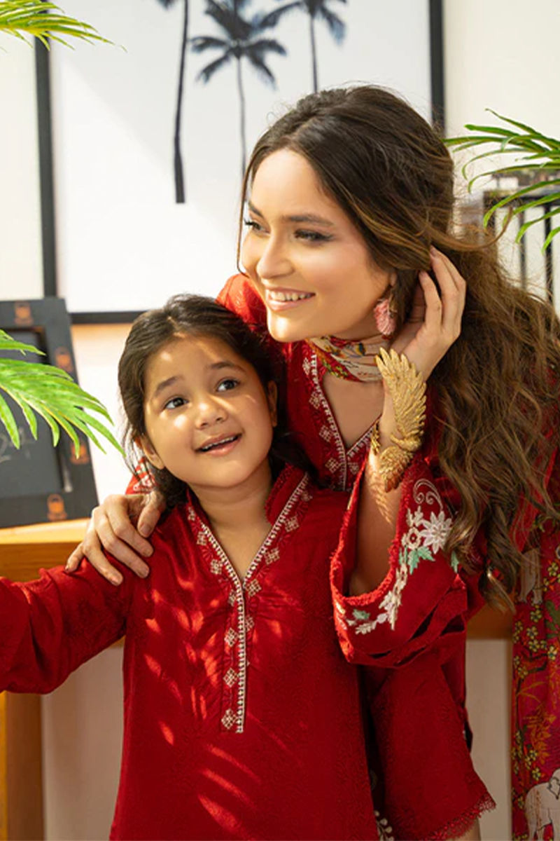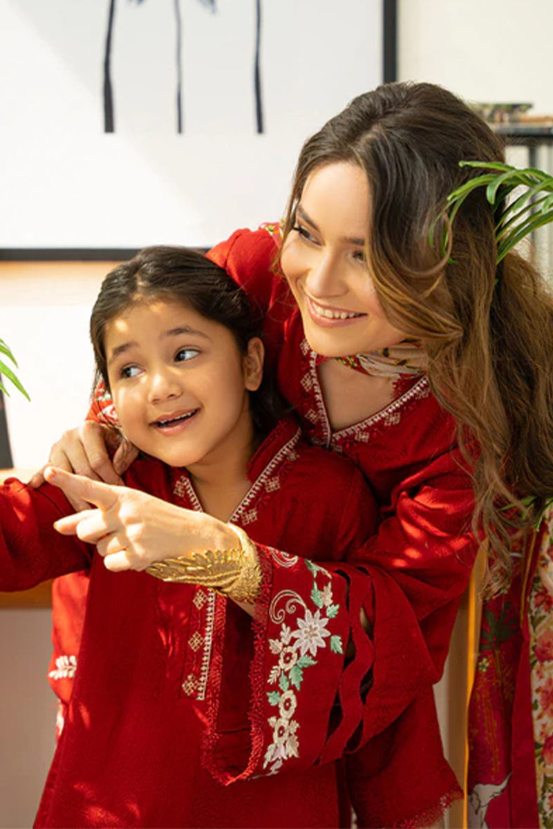 Twin with your little one this season in this deep red cherry kurta with minimal embroidery on neckline and lace detailings on sleeves,daman and neckline.skinny shalwar is on plain silk.Shirt: In-House Embossed SilkShalwar: In-House Embossed Silk