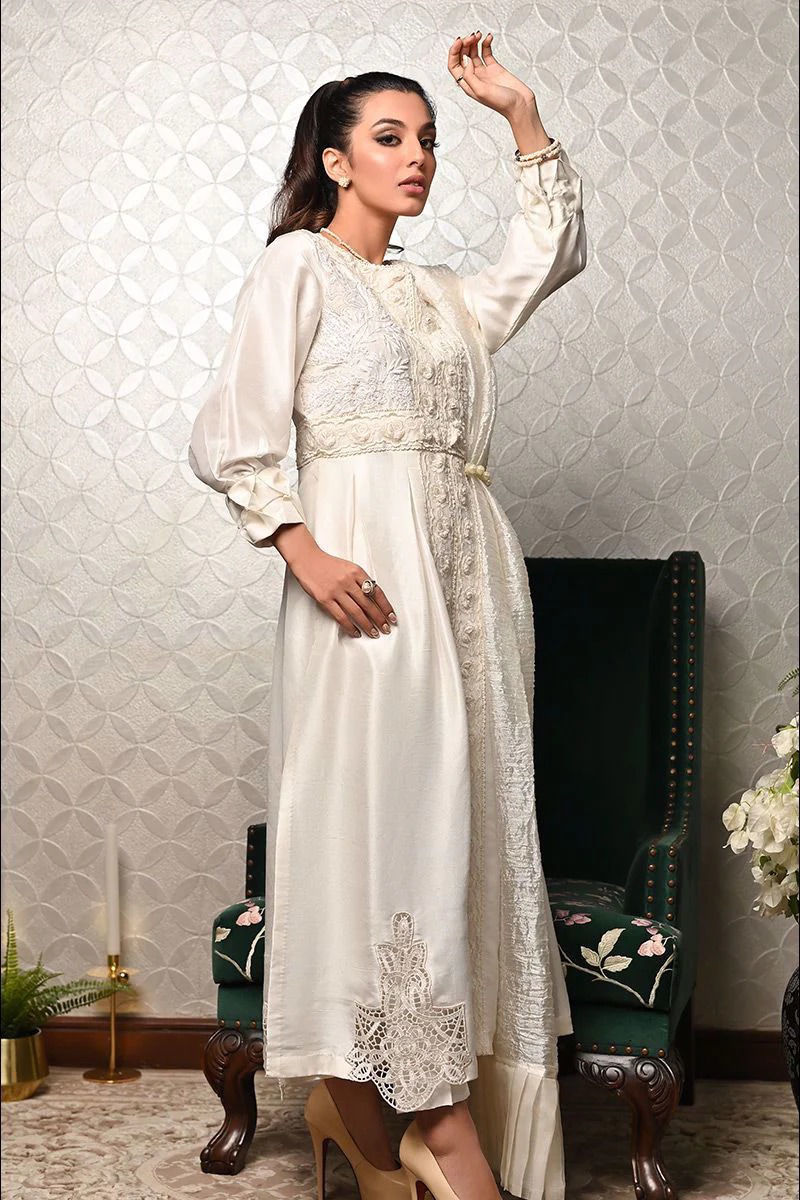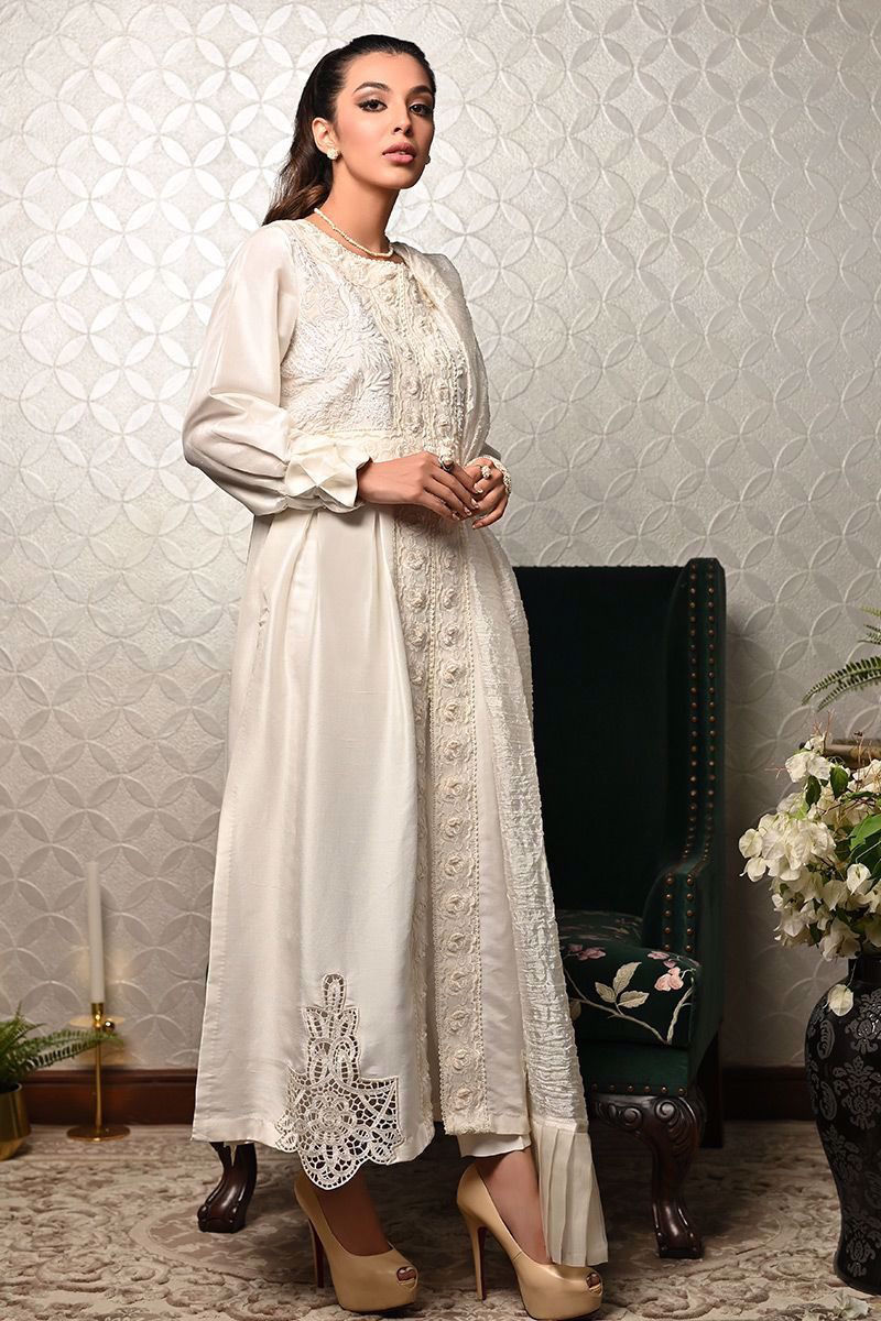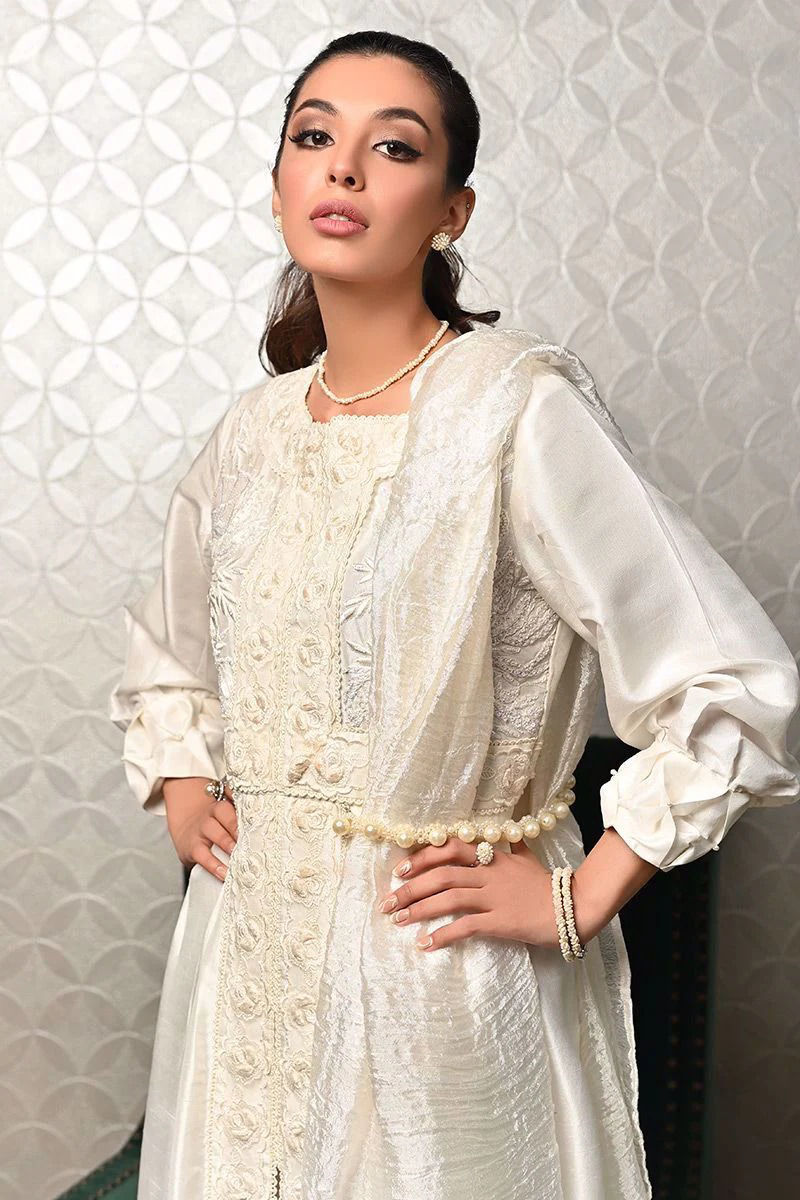 A classic white on white. Our love for whites is forever.Cut from plush silk with a modern front open silhouette. The bodice is fully embroidered and hand-worked. Statement pleated sleeves with edgy crushed dupatta are enough to turn heads around. You can dress this outfit up or down to make it fit for any occasion.Designers little secret tip, tie your hair in a classic bun or a pony to show off the statement back.Shirt: Raw SilkDupatta: Raw Silk
