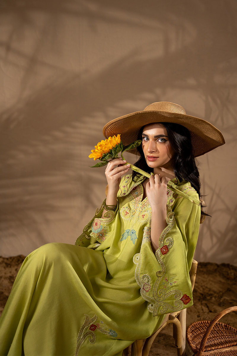 Breeze into elegance with bold florals and sunlit hues — this Khaddi Silk kaftan is a true statement of effortless luxury. Adorned with intricate embroidery and delicate appliqu florals, every detail is thoughtfully placed to enhance the kaftans fluid silhouette along with trumpet sleeves. The contrasting summer tones bring a refreshing vibrance, while the natural texture of Khaddi Silk offers breathable comfort with a touch of rustic charm. Graceful yet contemporary, this piece is perfect for daytime gatherings, resort wear, or any moment that calls for elevated ease.Shirt maximum length 53Model height 5'2
