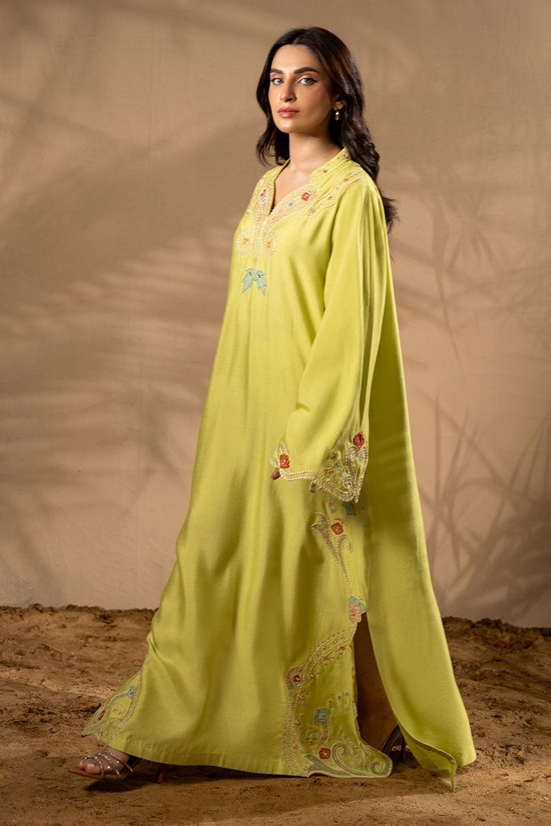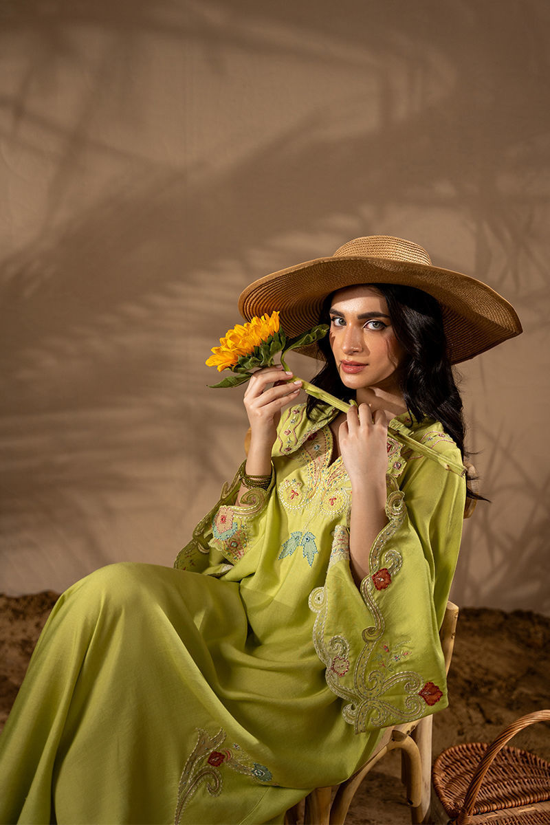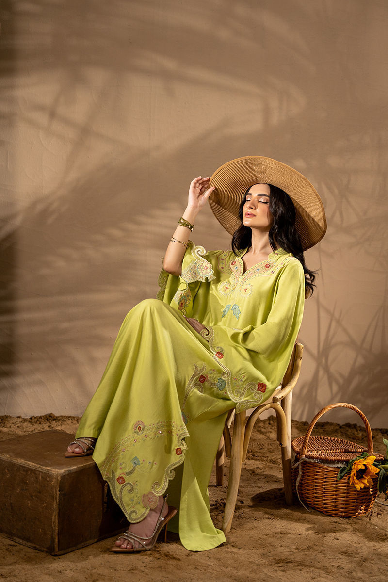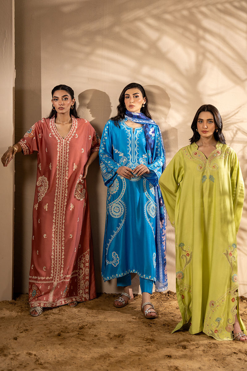 Breeze into elegance with bold florals and sunlit hues — this Khaddi Silk kaftan is a true statement of effortless luxury. Adorned with intricate embroidery and delicate appliqu florals, every detail is thoughtfully placed to enhance the kaftans fluid silhouette along with trumpet sleeves. The contrasting summer tones bring a refreshing vibrance, while the natural texture of Khaddi Silk offers breathable comfort with a touch of rustic charm. Graceful yet contemporary, this piece is perfect for daytime gatherings, resort wear, or any moment that calls for elevated ease. Shirt maximum length: 53 Model height: 5'2