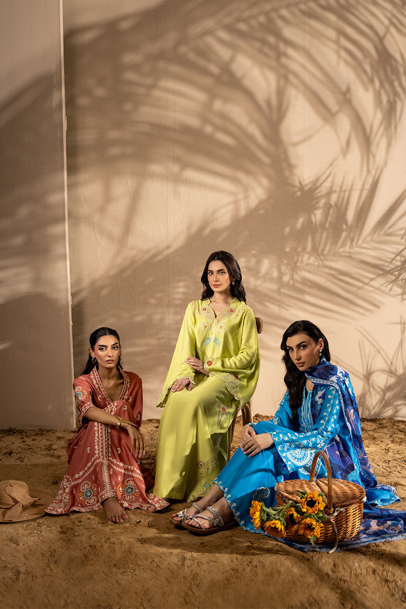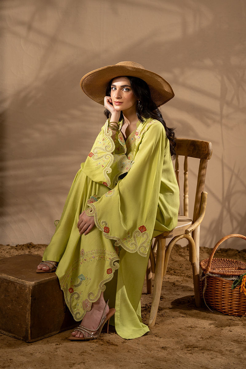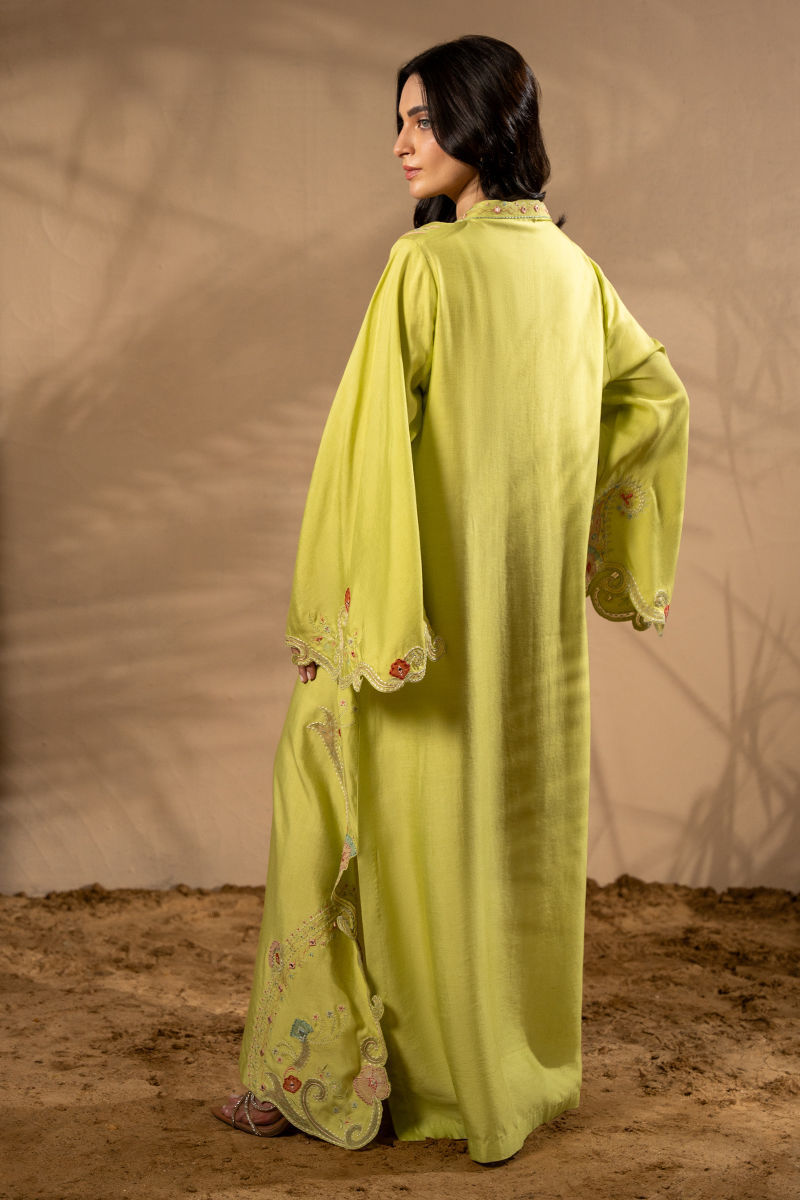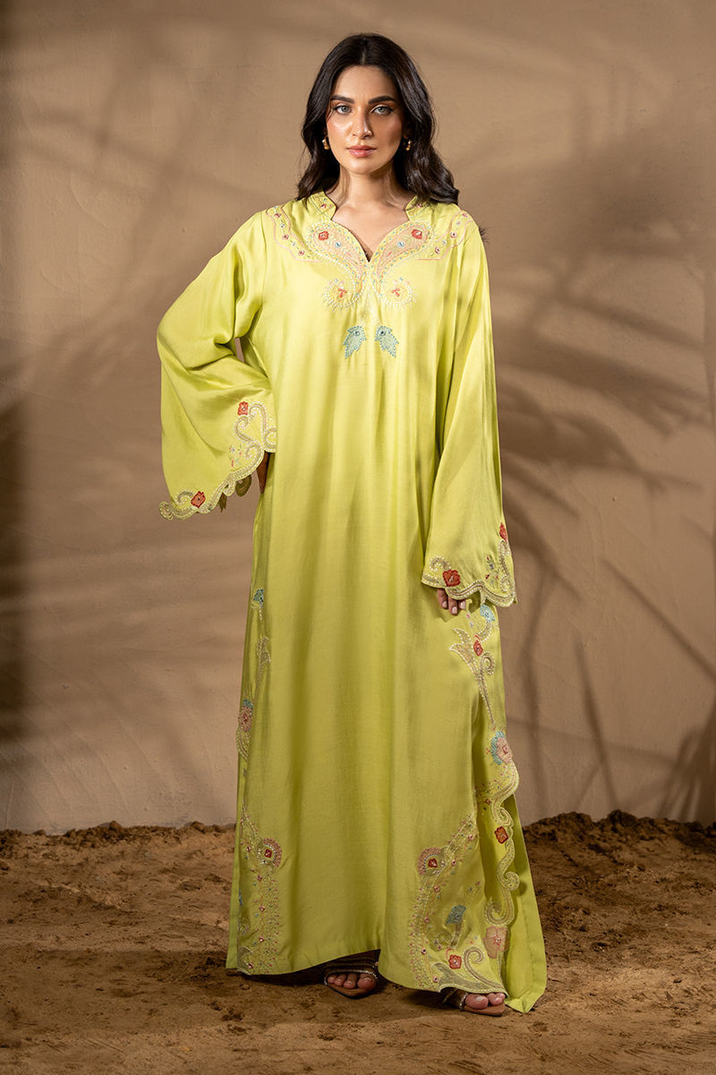 Breeze into elegance with bold florals and sunlit hues — this Khaddi Silk kaftan is a true statement of effortless luxury. Adorned with intricate embroidery and delicate appliqu florals, every detail is thoughtfully placed to enhance the kaftans fluid silhouette along with trumpet sleeves. The contrasting summer tones bring a refreshing vibrance, while the natural texture of Khaddi Silk offers breathable comfort with a touch of rustic charm. Graceful yet contemporary, this piece is perfect for daytime gatherings, resort wear, or any moment that calls for elevated ease. Shirt maximum length: 53 Model height: 5'2