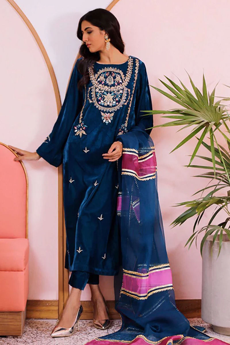 A plush velvet in deep turquoise shade perfect for any winter soirée! It is adorned with intricate gold handwork and silk thread in shades of deep turquoise magenta and plum. The organza statement dupatta in rich winter shades of plum and turquoise will definitely make you stand out.* Please note the price of the silk fabric option includes the complete outfit.
