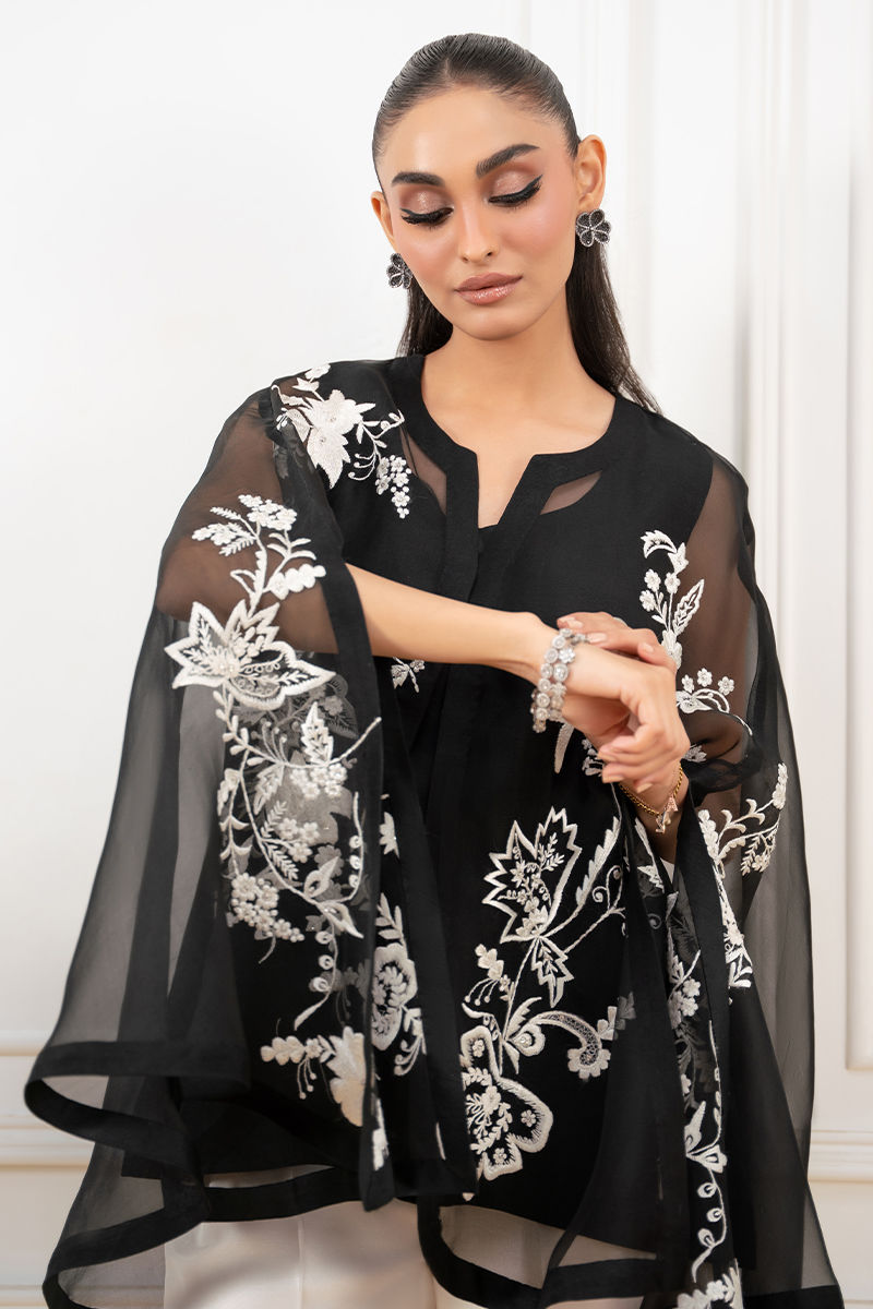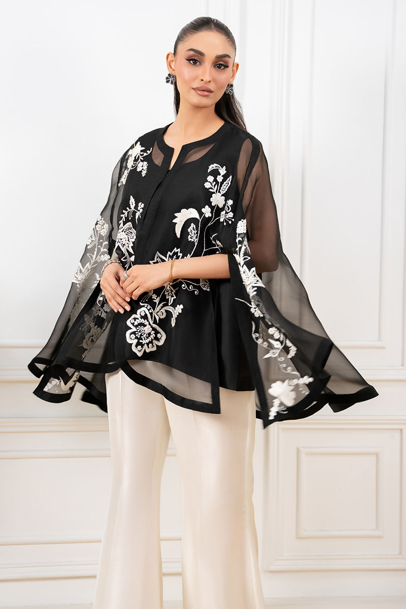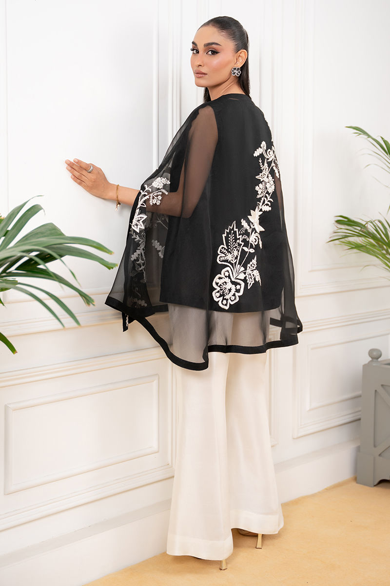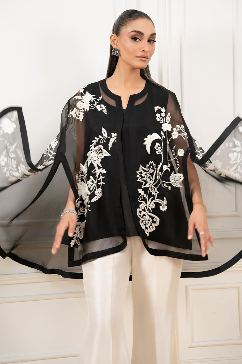 A statement black pure organza cape, beautifully adorned with intricate anchor embroidery that adds texture and depth to its sheer elegance. Layered over a sleek black slip, it creates a graceful, modern silhouette. Paired with boot cut pants, the ensemble blends contemporary style with effortless sophistication.