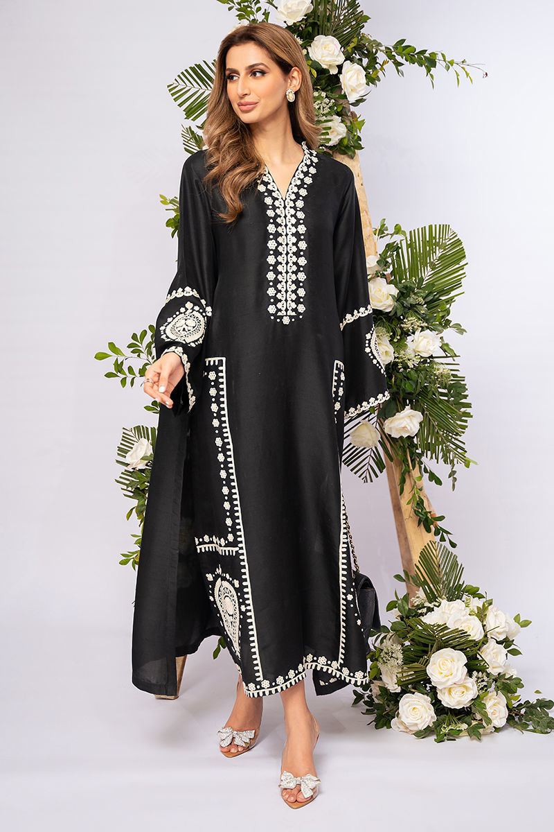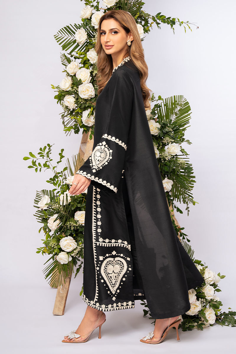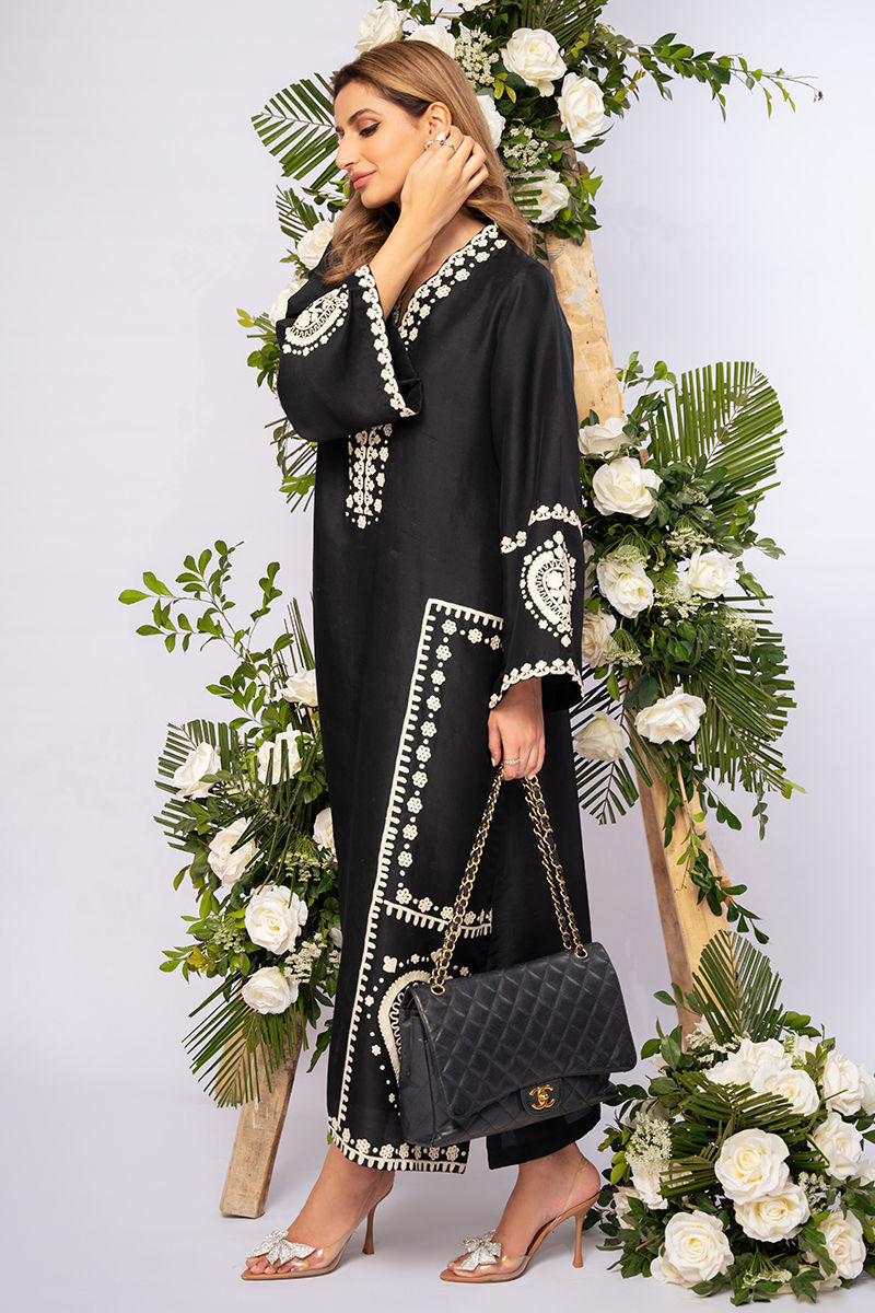 Pure raw silk shirt with impactful Off-white aari embroideries all over. Pants are on pure raw silk combining the look for the opulent and classic look. Style it up with statement bags and jewelry for a showstopper look!