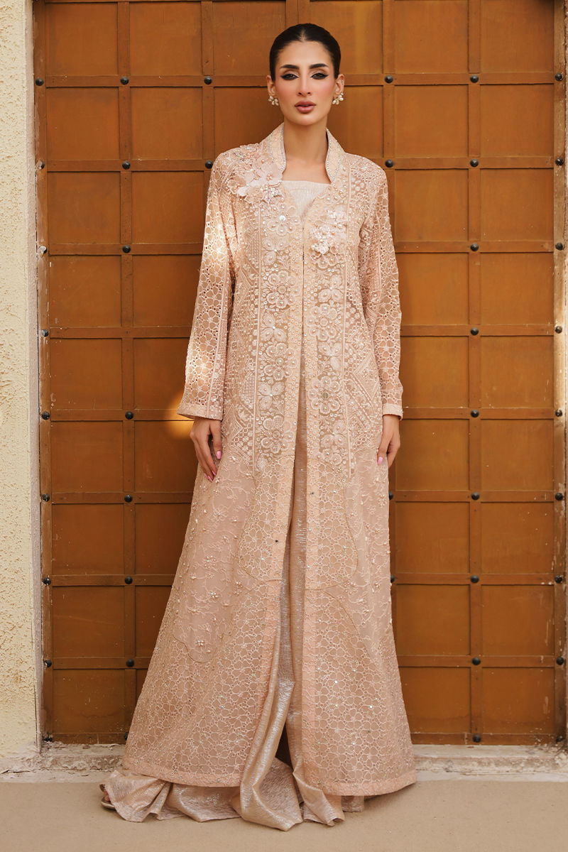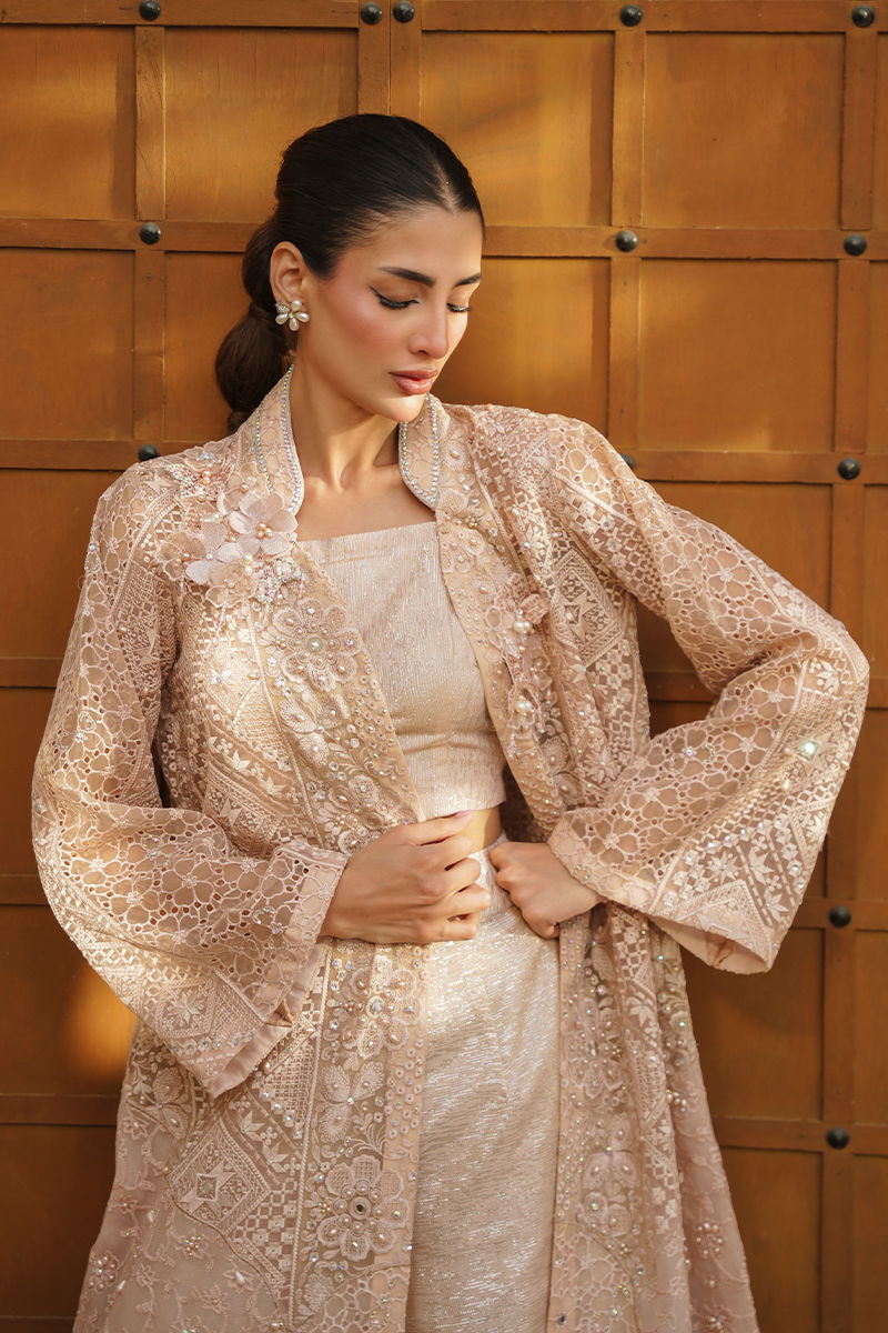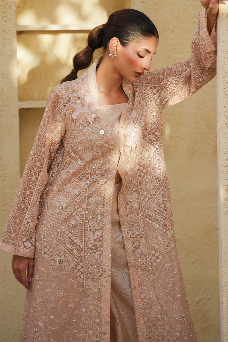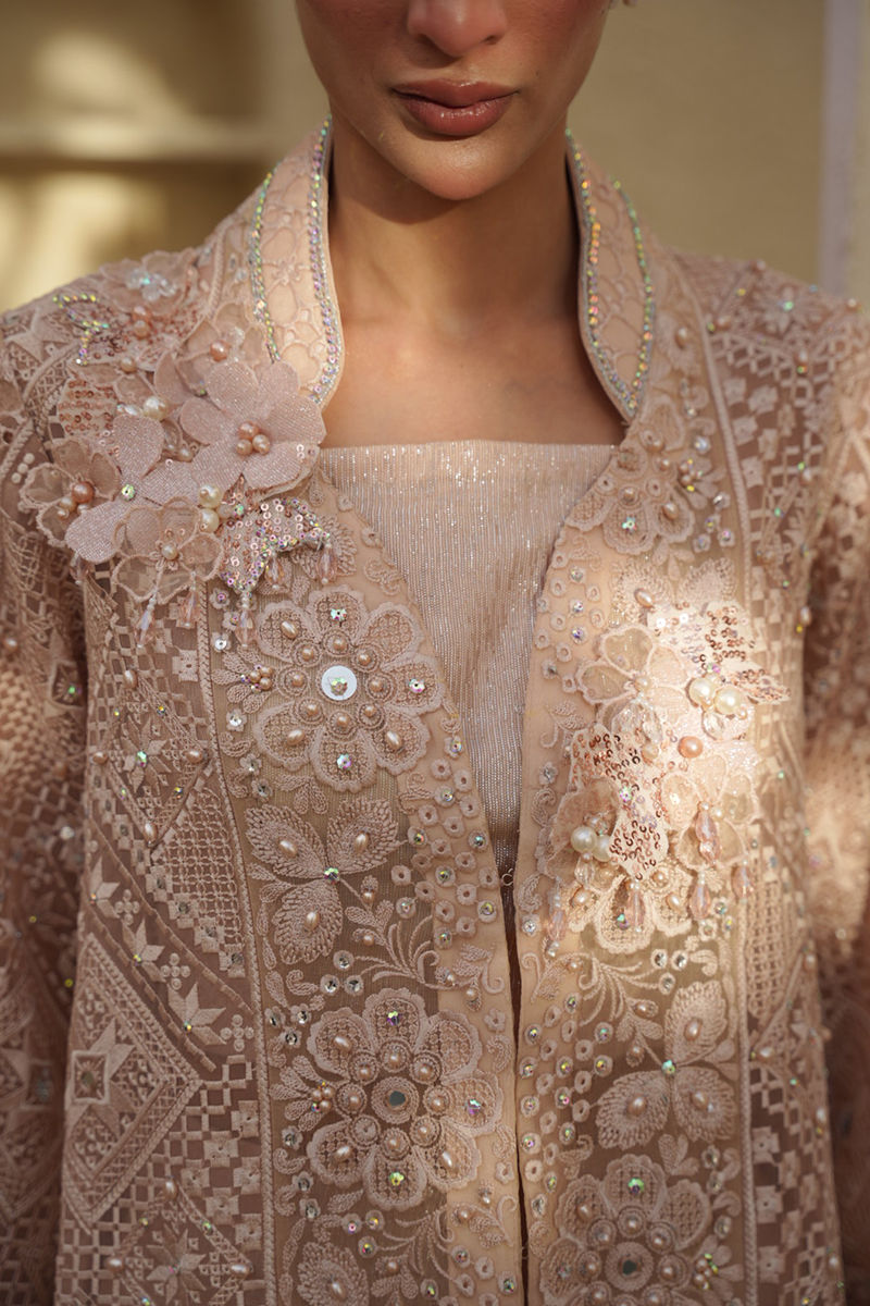 A statement pink long organza jacket, richly embroidered and elevated with intricate fabric manipulation, adorned with mirror, crystal, resham, and pearl work for a multidimensional shimmer. The neckline is beautifully detailed with 3D floral cutouts, adding depth and a couture touch. Paired with a sleek inner blouse and a shimmer fabric dhaka, the ensemble exudes regal elegance with a contemporary edge.