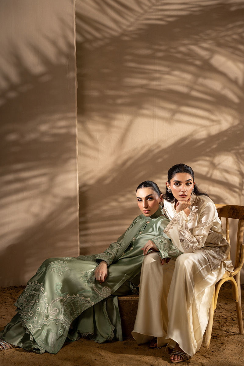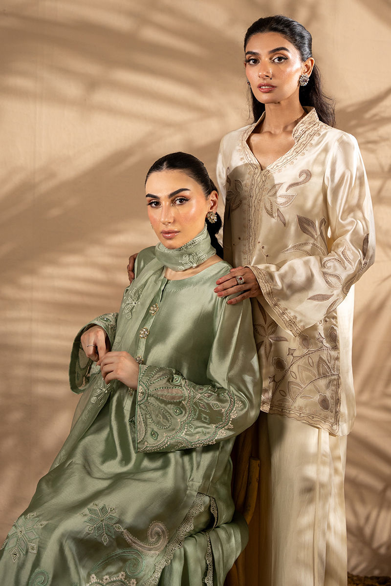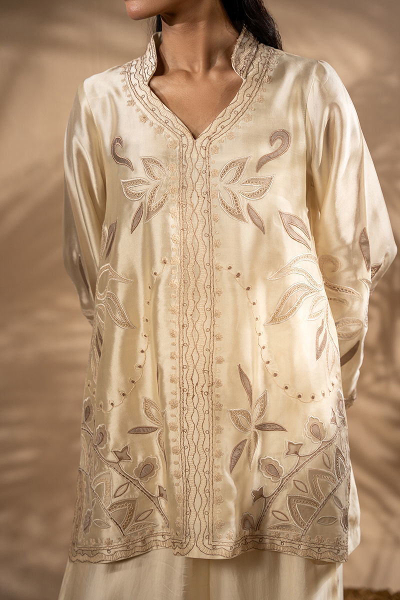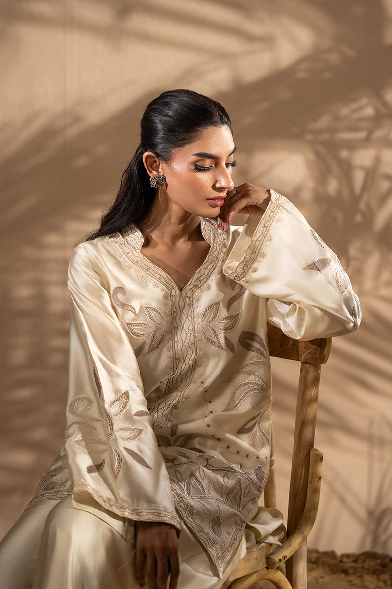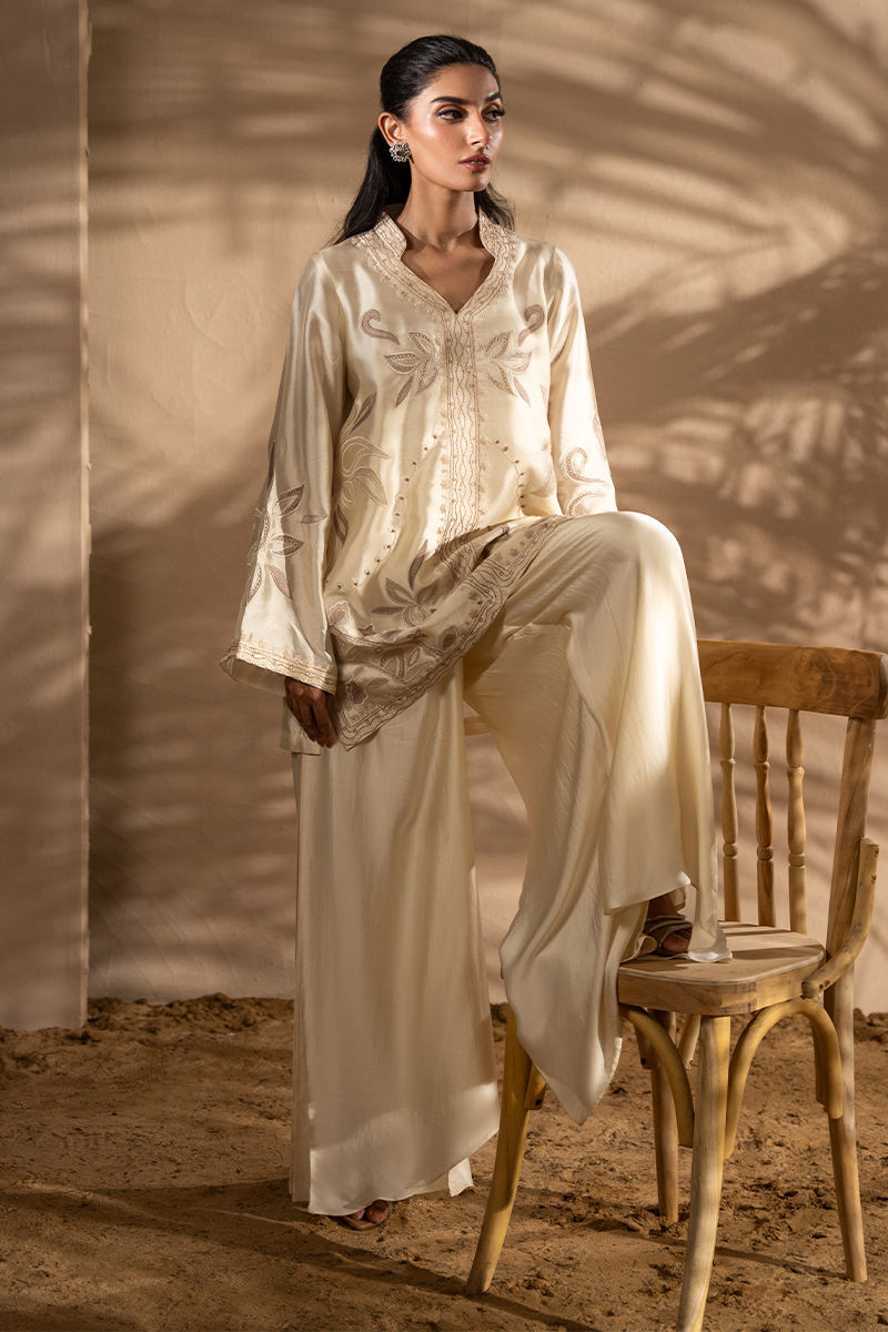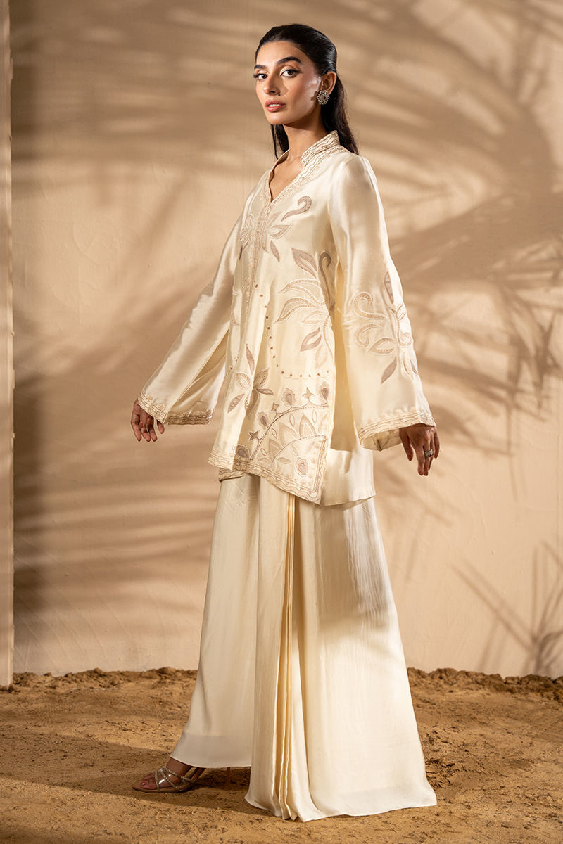This stunning ensemble features a sheesha silk jacket, intricately embroidered with soft tones of beiges appliques that bring a touch of natures beauty to life. Paired with a luxurious satin silk the dhoti pant drapes effortlessly, its smooth satin silk fabric enhancing the outfit's sophisticated flow.Jacket length 30Model height 5'5