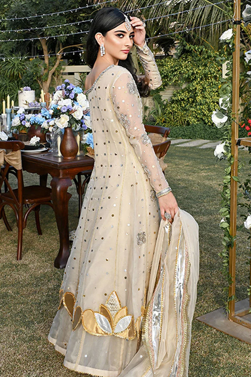 Beautiful Ivory kalidar with signature boat neckline in mirror and zardozi work. A spray of gold and silver sitara and zardozi booties all over the peshwas makes it perfect for this wedding season. The daman is beautifully appliqued in our signature floral motifs. It is complemented with silk pants and tissue dupatta finished with gota and kiran laces and spray of gold silver sitara. Shirt: Silk Dupatta: Silk Pant: Silk