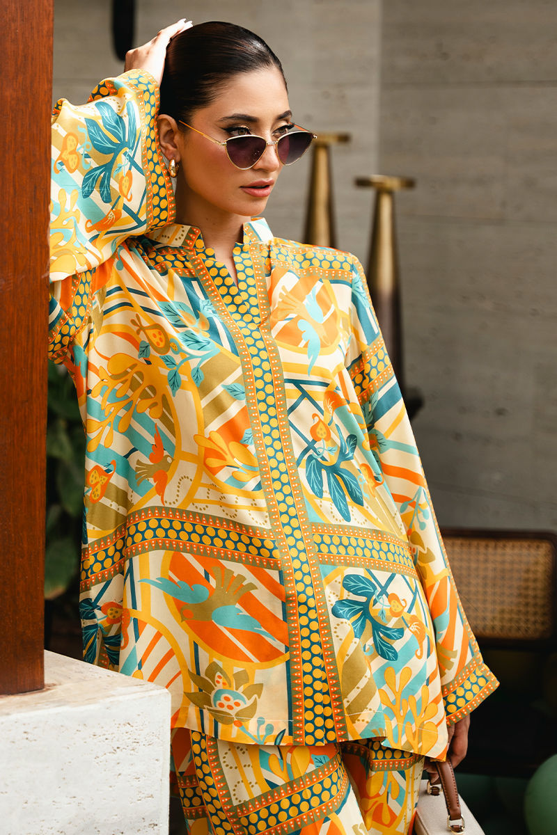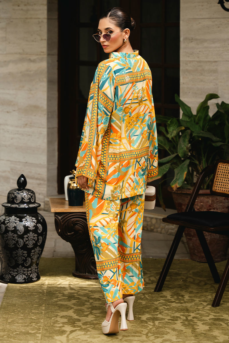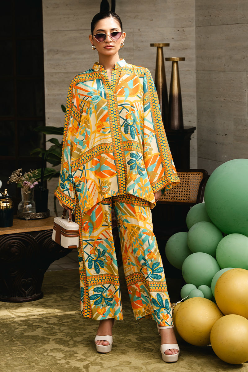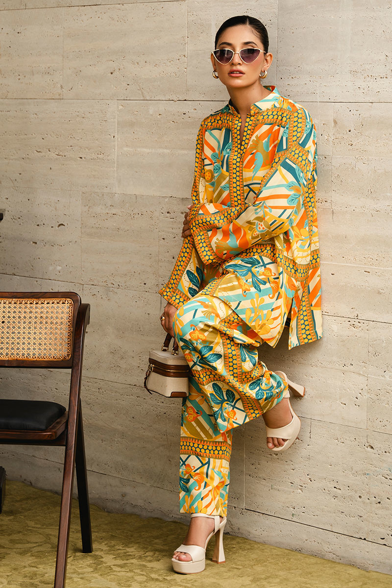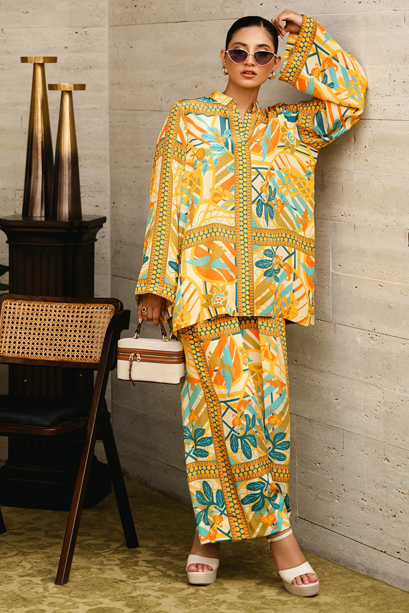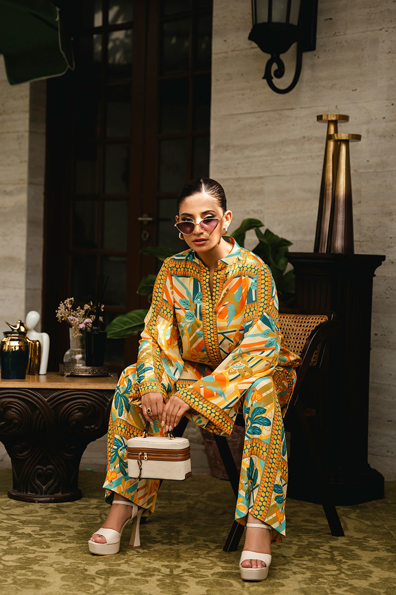 Discover the allure of contemporary design with this in-house created co-ord set featuring a distinctive floral geometric print in vibrant shades of yellow, blue, and green. Tailored from luxurious crepe fabric, the set effortlessly combines floral elements with geometric patterns, creating a visually striking yet harmonious look. The top is designed with a modern cut that flatters the figure, while the coordinating bottoms provide a sleek and cohesive finish. The bright and lively nature of the outfit makes it a versatile choice for occasions where you want to make a confident, stylish statement. Shirt: Crepe Trouser: Crepe