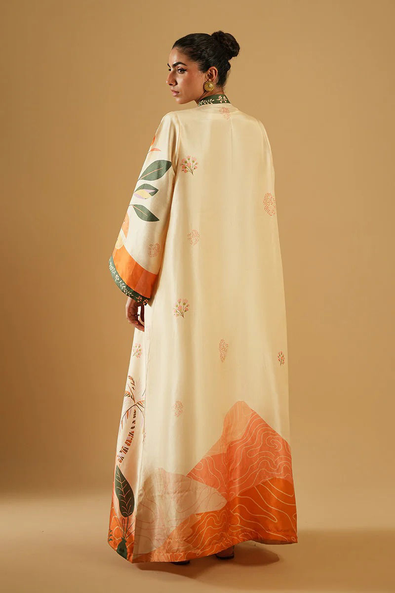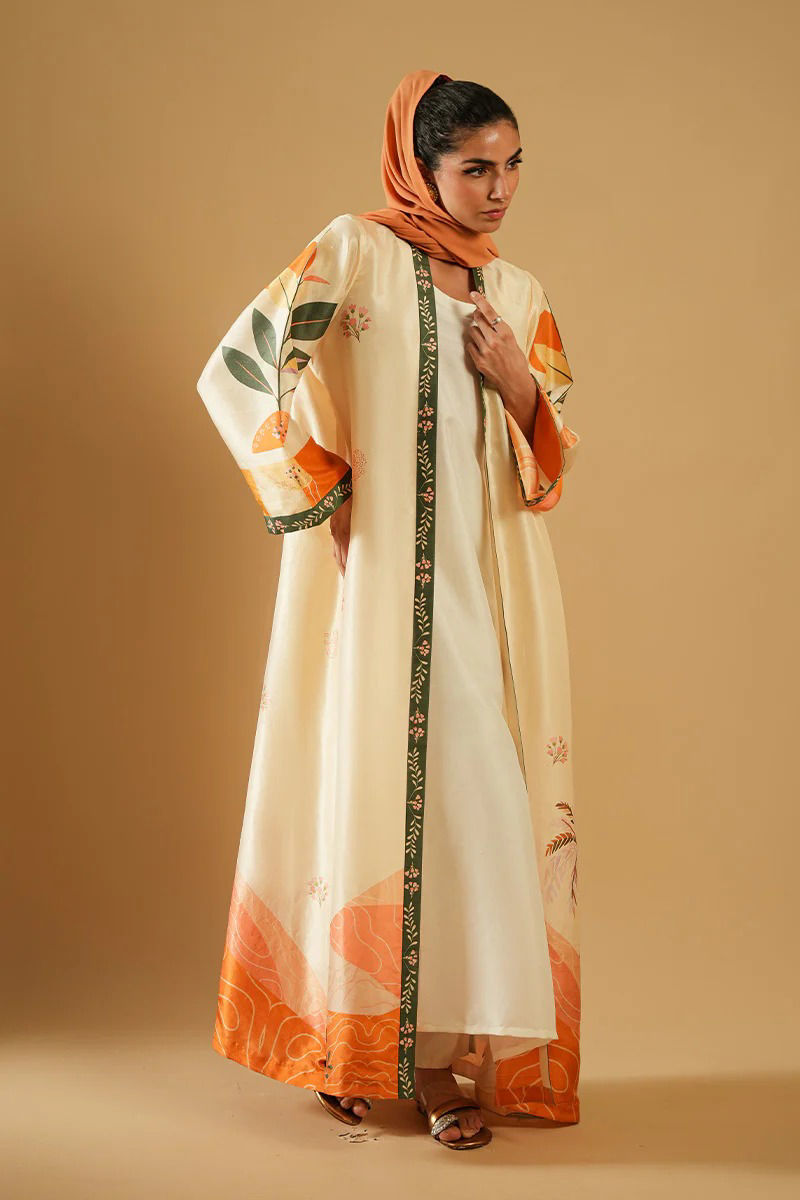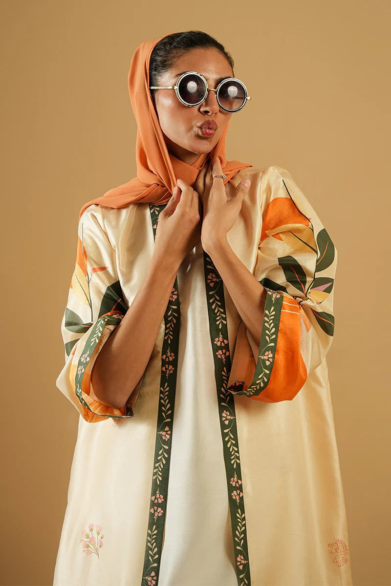 Chic yet classy? always a yes. This breathtaking printed pure raw silk abaya cut features a stunning design inspired by the serene beauty of nature, with a print that evokes the essence of palm trees, sand dunes, and sunset hues. Paired with the abaya is an ivory pure raw silk slip, which adds a subtle touch of contrast and ensures comfort and coverage beneath the abaya. Make your iftaars and eid dinner chic yet modest. Model height 5'10. Maximum shirt length 58"
