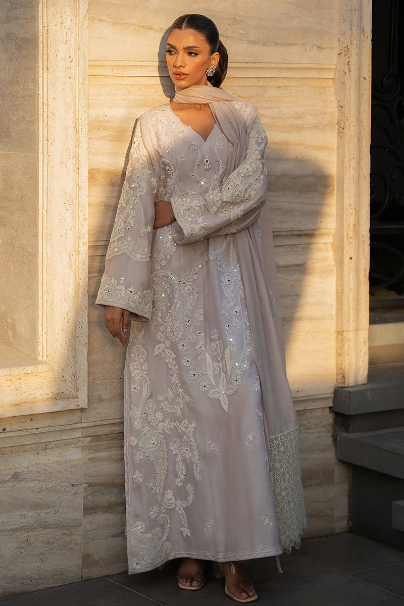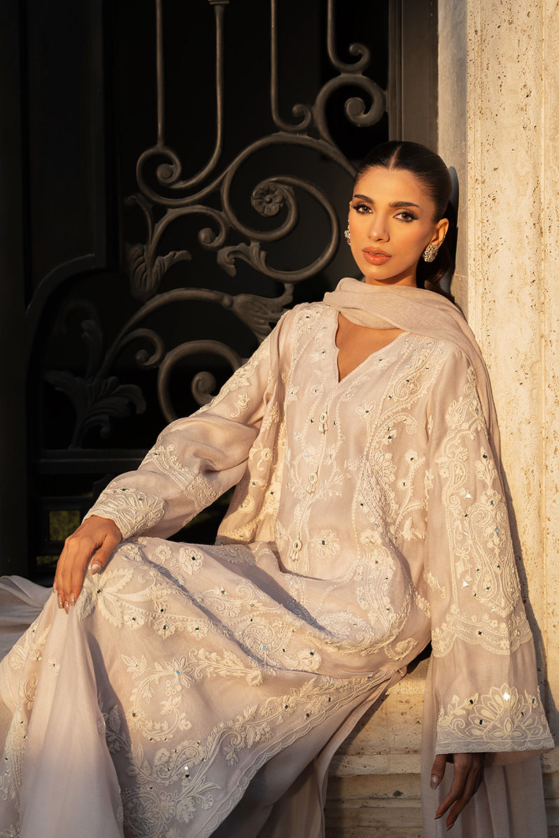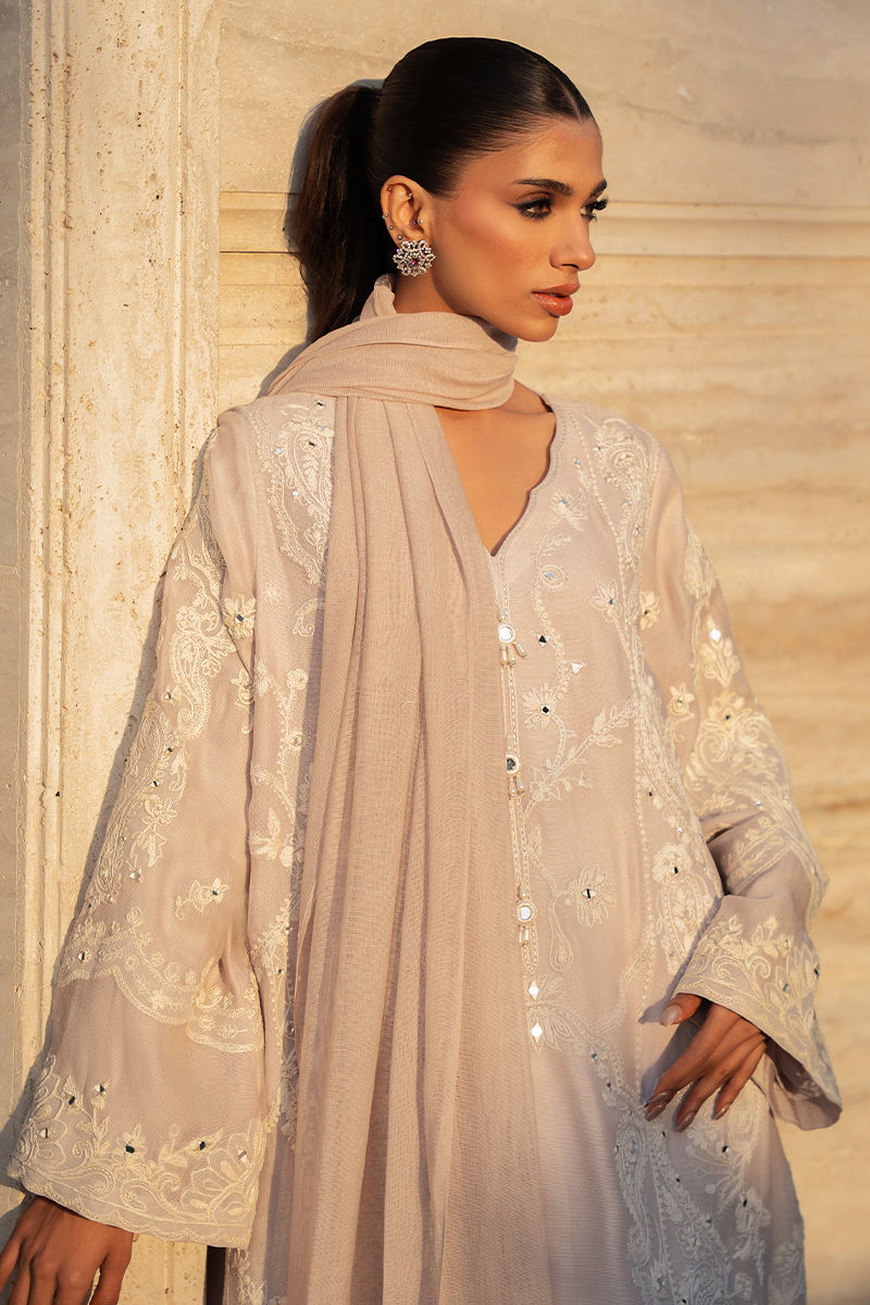 A charming cotton net shirt adorned with delicate anchor embroidery and sparkling sheesha detailing all over for a subtle shimmer. Paired with a cotton net dupatta finished with our in-house floral embroidered silk, and complemented with matching pants as an elegant add-on. Model is wearing 54" length