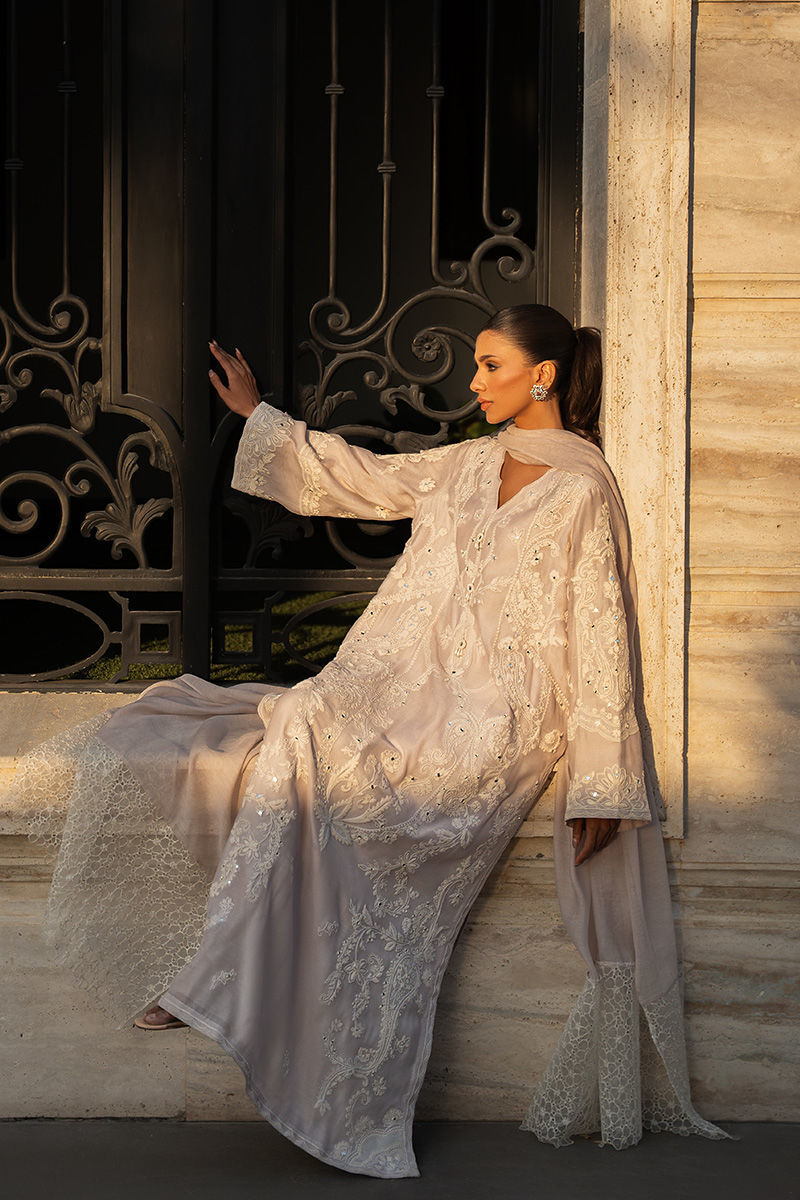 A charming cotton net shirt adorned with delicate anchor embroidery and sparkling sheesha detailing all over for a subtle shimmer. Paired with a cotton net dupatta finished with our in-house floral embroidered silk, and complemented with matching pants as an elegant add-on. Model is wearing 54" length