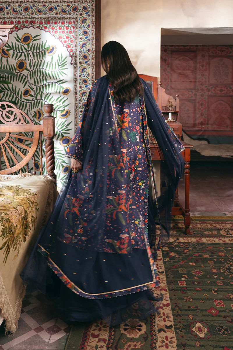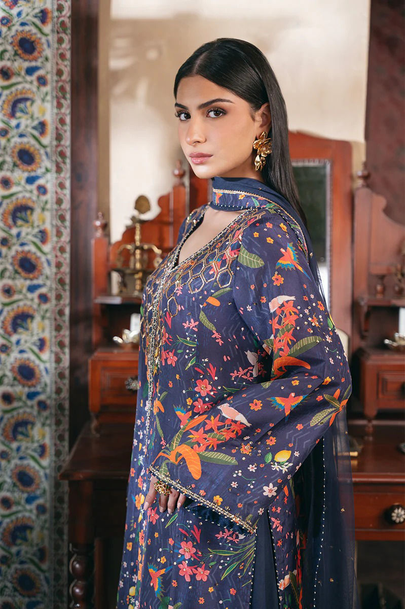 Blue is the new classic, and we’re here for it! This breathtaking tropical print outfit is a true showstopper, adorned with intricate handwork of sequins, stones, and moti. The delicate embellishments on the neckline, sleeves and hemline makes it the perfect choice for grand occasions. The look is completed with a sheer net dupatta, carefully finished to add a touch of ethereal charm. Pair it with a net lehenga, exuding grace. Style it with statement jewelry and heels to create a timelessly elegant look that’s bound to turn heads at any celebration!