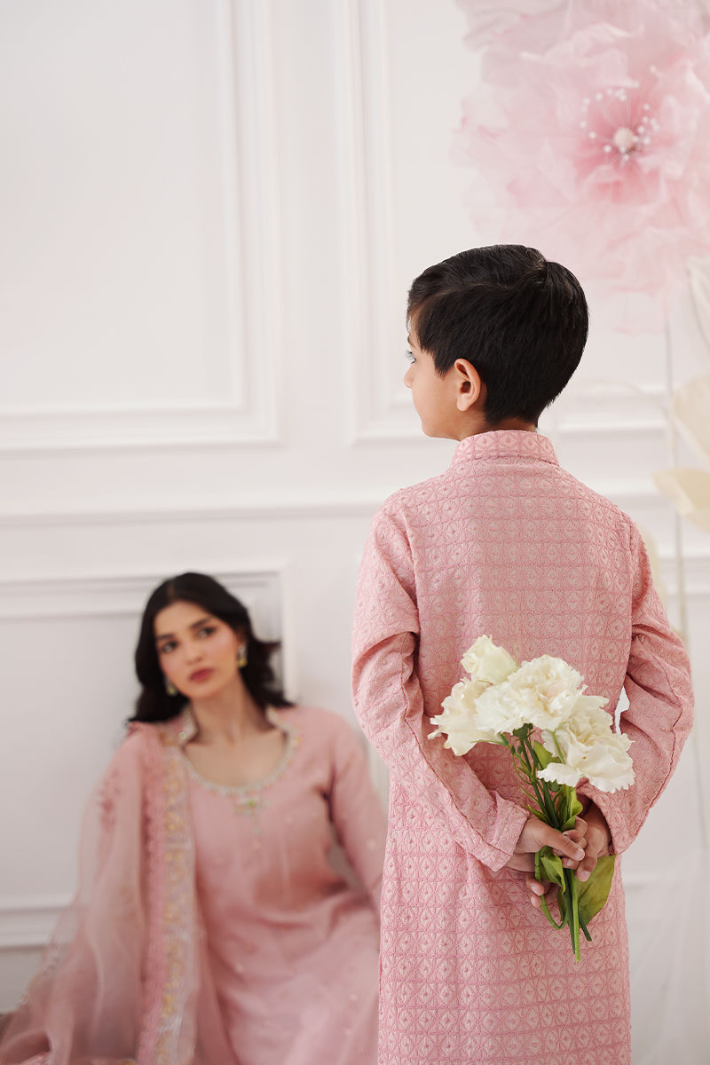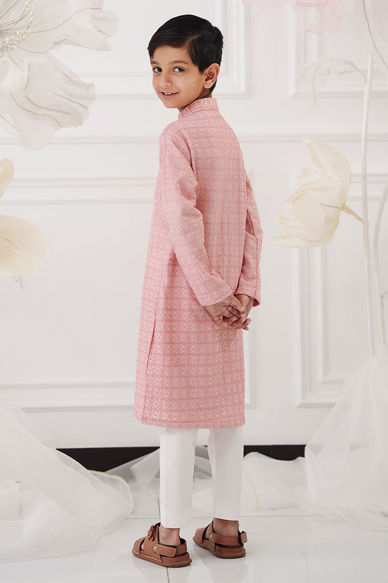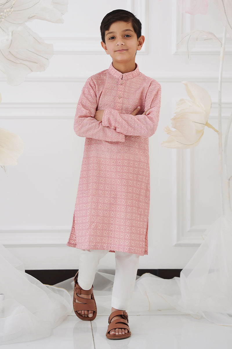 A charming pastel pink kurta for little boys, crafted in soft schiffli fabric with delicate embroidery adding a subtle, playful texture. The straight, comfortable cut ensures ease of movement, while the coordinating cotton straight pants complete the look with effortless style. Perfect for festive occasions, family gatherings, or casual outings, this outfit balances comfort with a touch of cheerful elegance for young boys