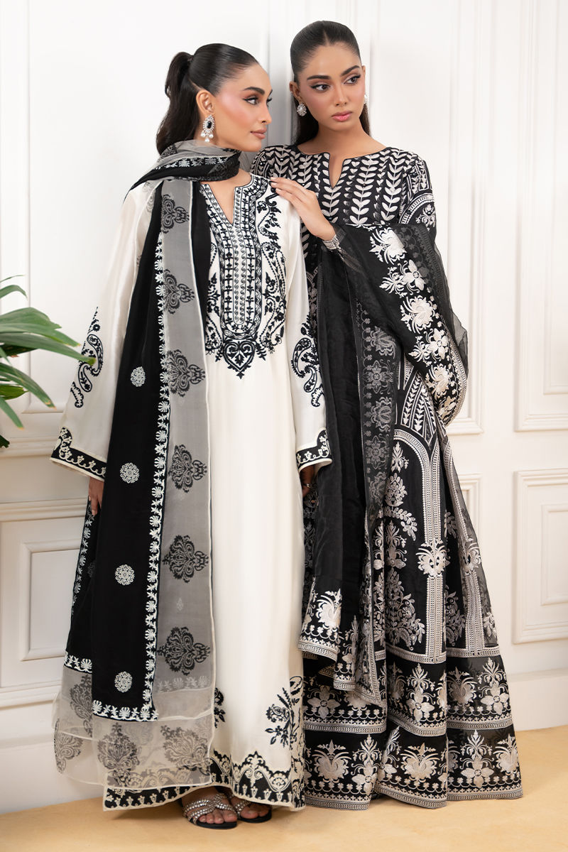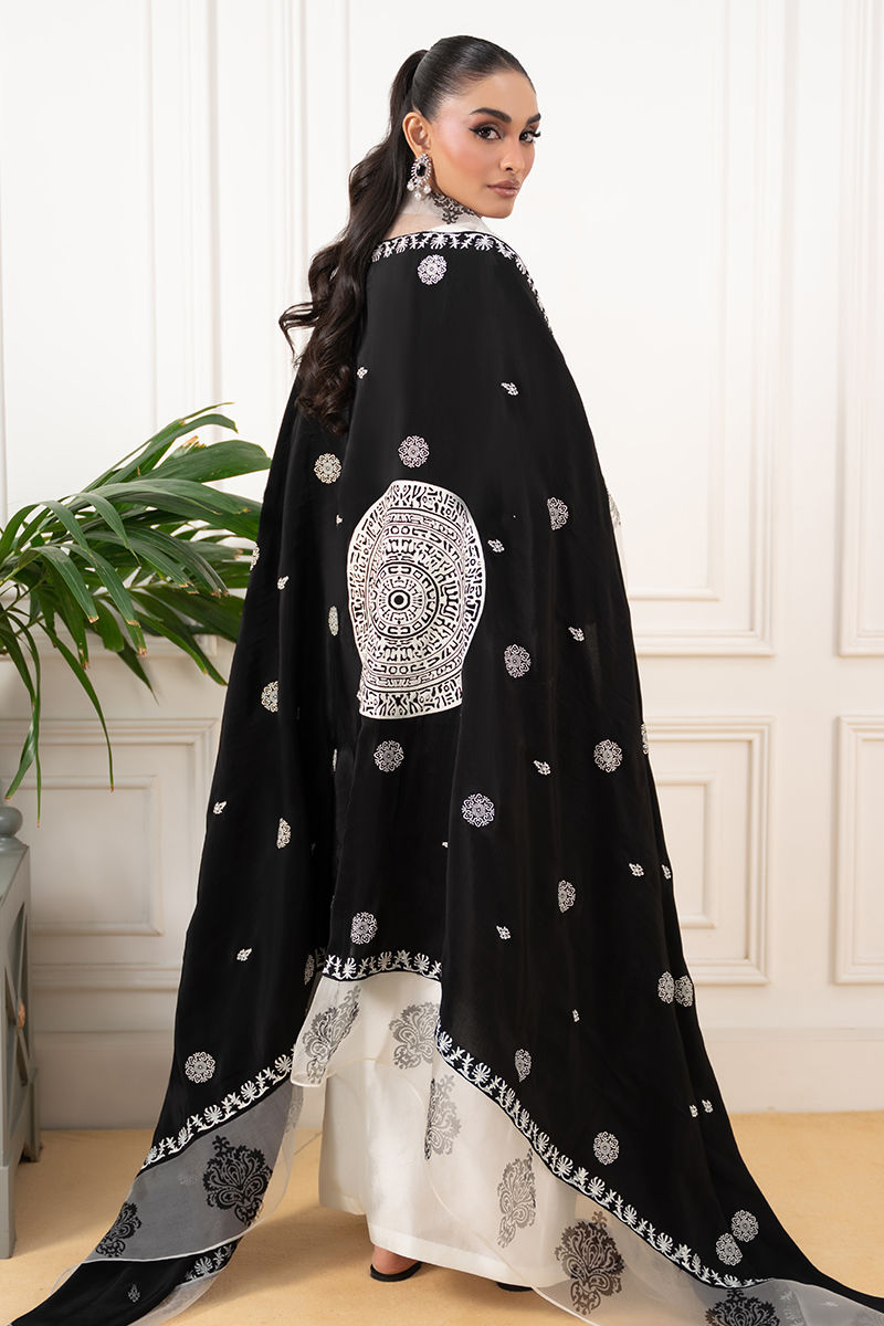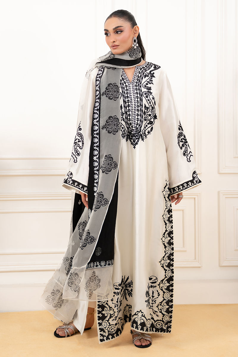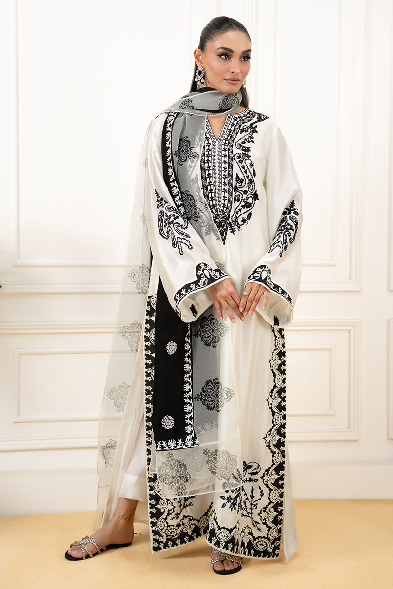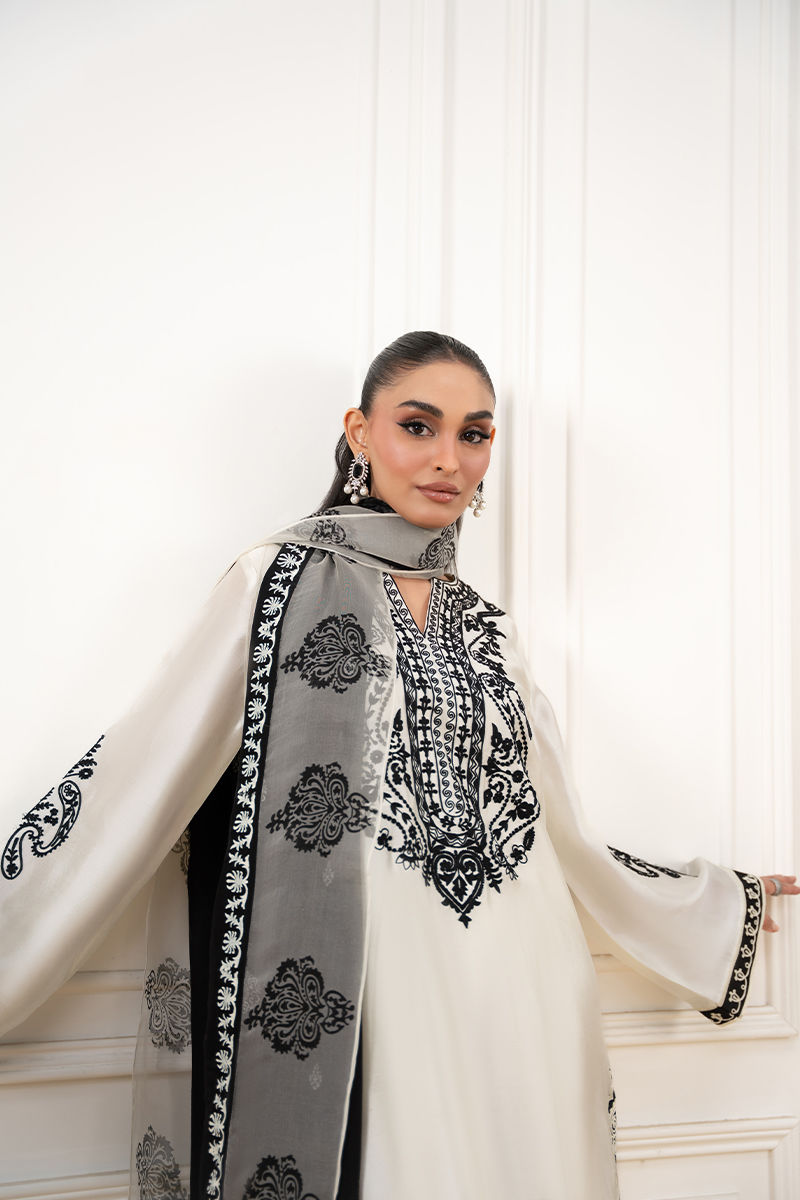 An elegant ivory shirt featuring bold black colorblock detailing, delicately enhanced with intricate Aari embroidery for a refined, timeless look. Paired with a crepe silk dupatta adorned with traditional block printing, and complemented by sleek straight pants for a polished finish.