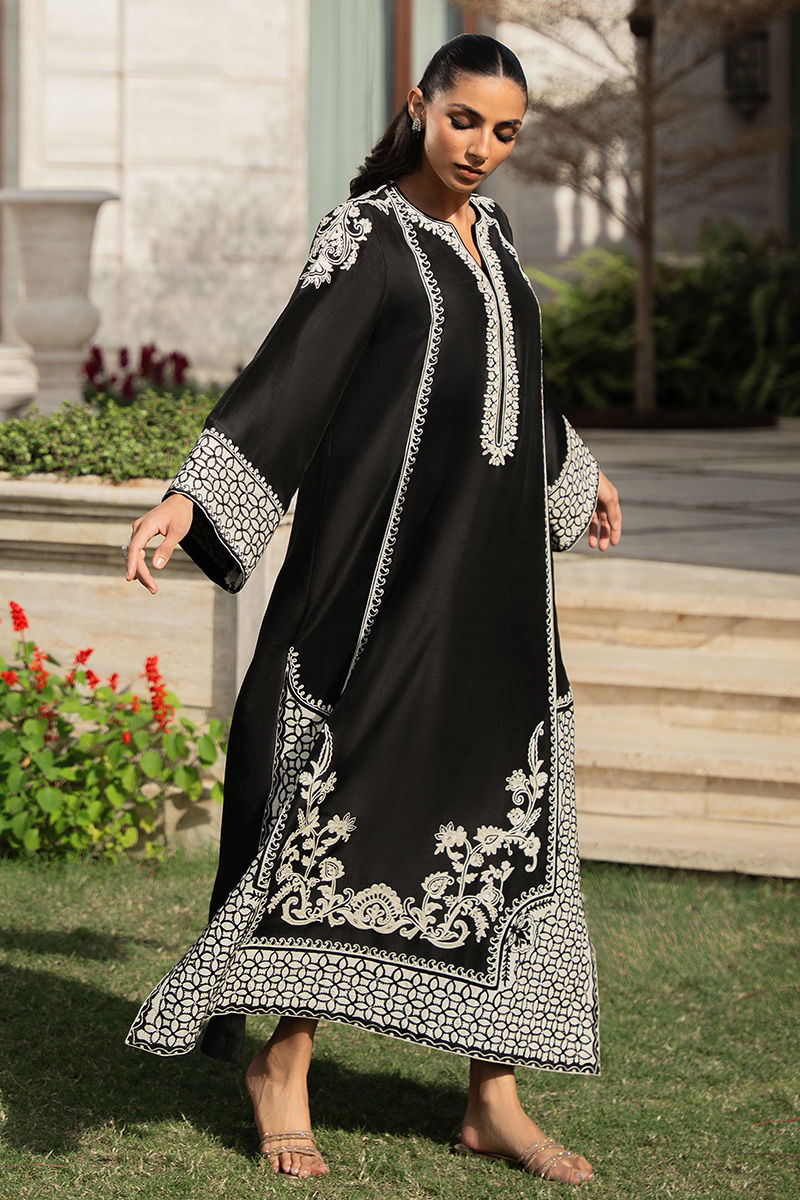 A striking black pure rawsilk kaftan cut, elevated with intricate aari embroidery and graceful ivory fabric appliqué detailing on the hem and sleeves. The embroidery is further enhanced with subtle Swarovski crystal embellishments, adding a refined hint of shimmer to this timeless silhouette. Eid styling tip: pair with statement pearl earrings, metallic heels, and a sleek clutch for an effortlessly elegant festive look.Model is wearing 55" length