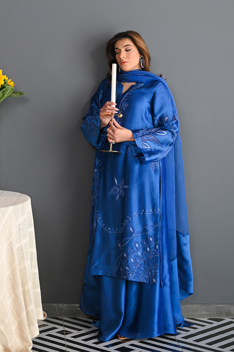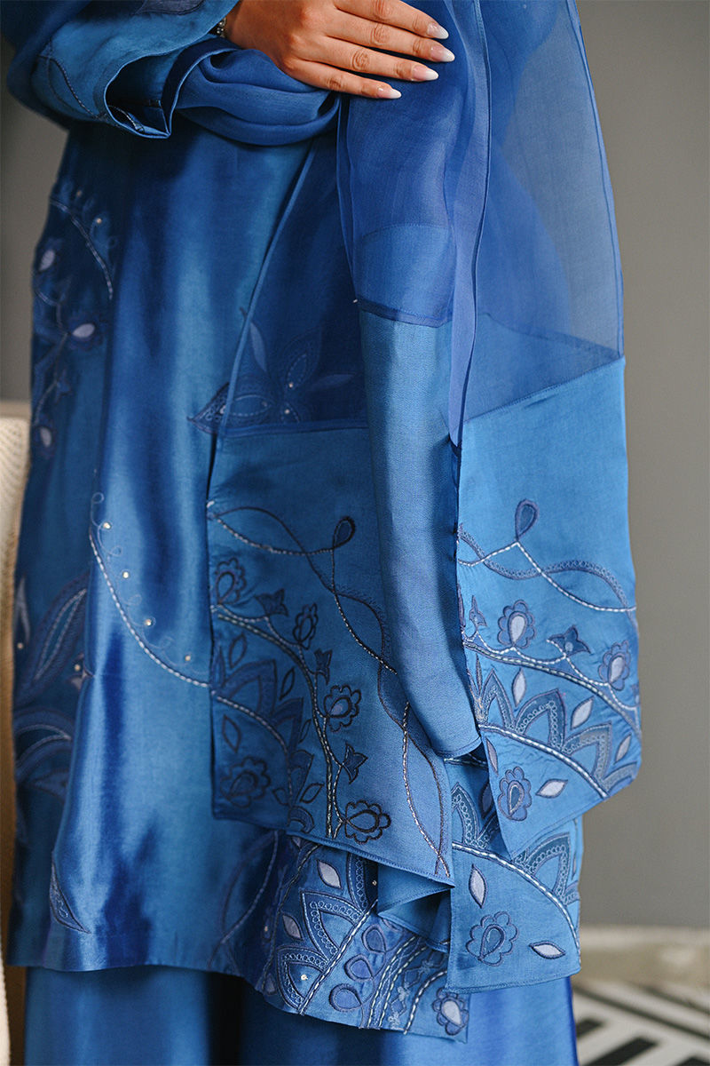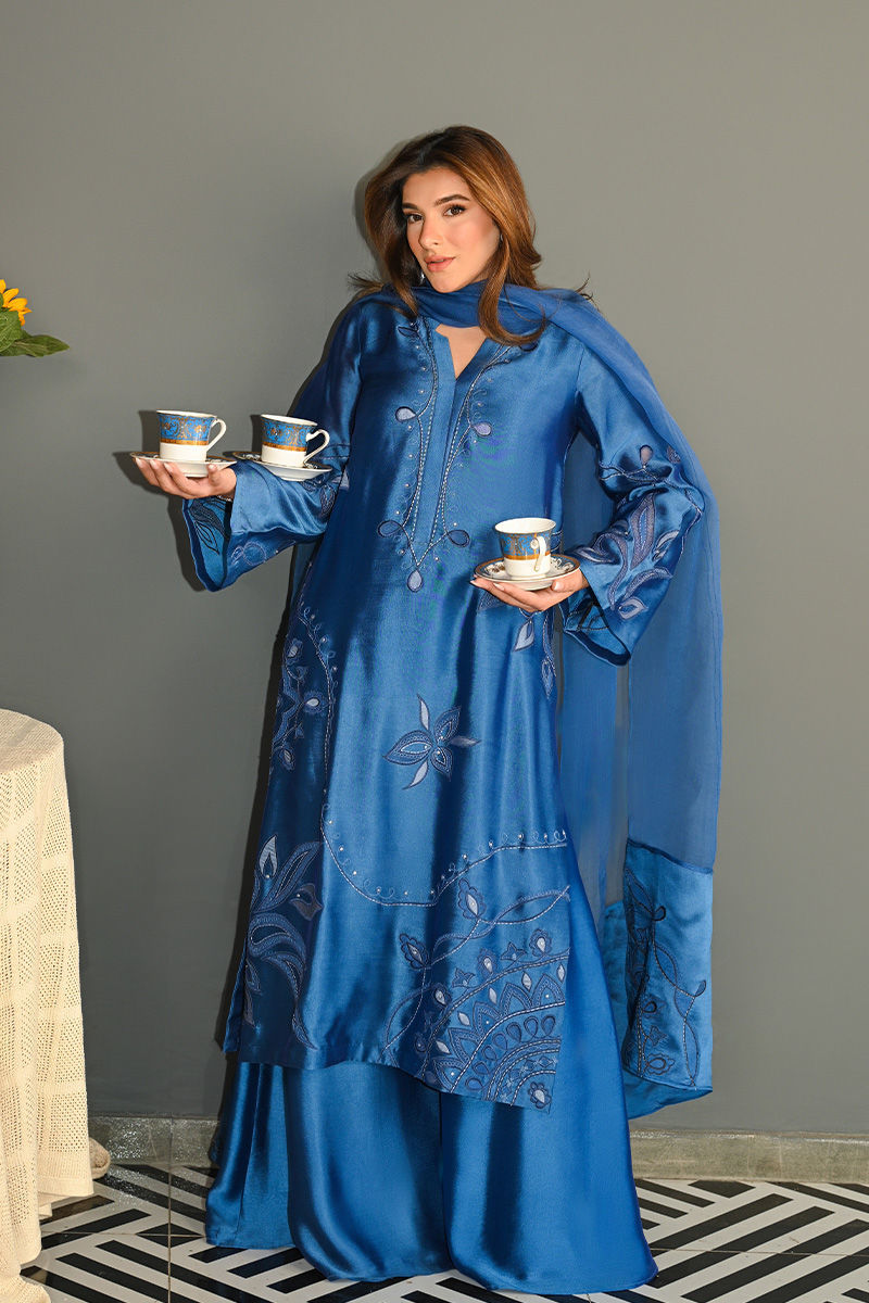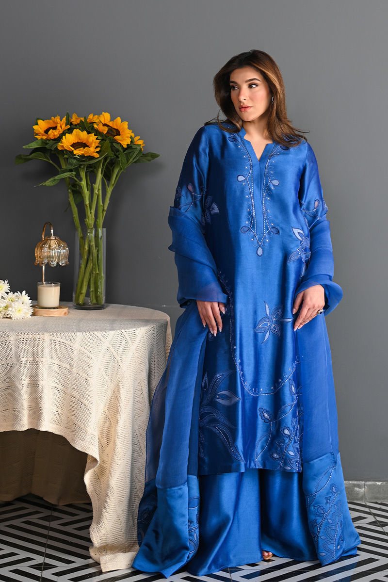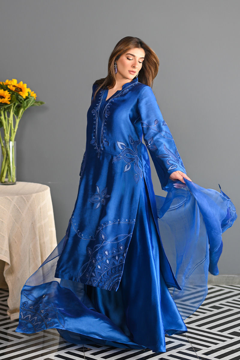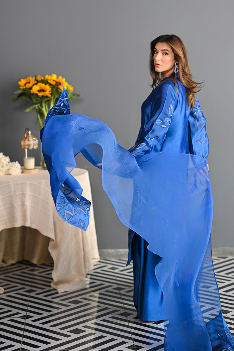 This vibrant electric blue sheesha silk outfit is a stunning masterpiece, featuring intricate floral motifs embroidered with precision. The floral designs are enhanced using delicate applique techniques with organza, creating a layered, textured effect that adds depth and dimension to the piece. Paired with this outfit is an ethereal organza dupatta, where applique floral motifs adorn the edges, complementing the design of the shirt. For an added layer of sophistication, a matching sheesha silk dhaka is an add on. This ensemble is perfect for anyone seeking a bold yet graceful statement for a special occasion. Shirt maximum length 48 Model height 5'5