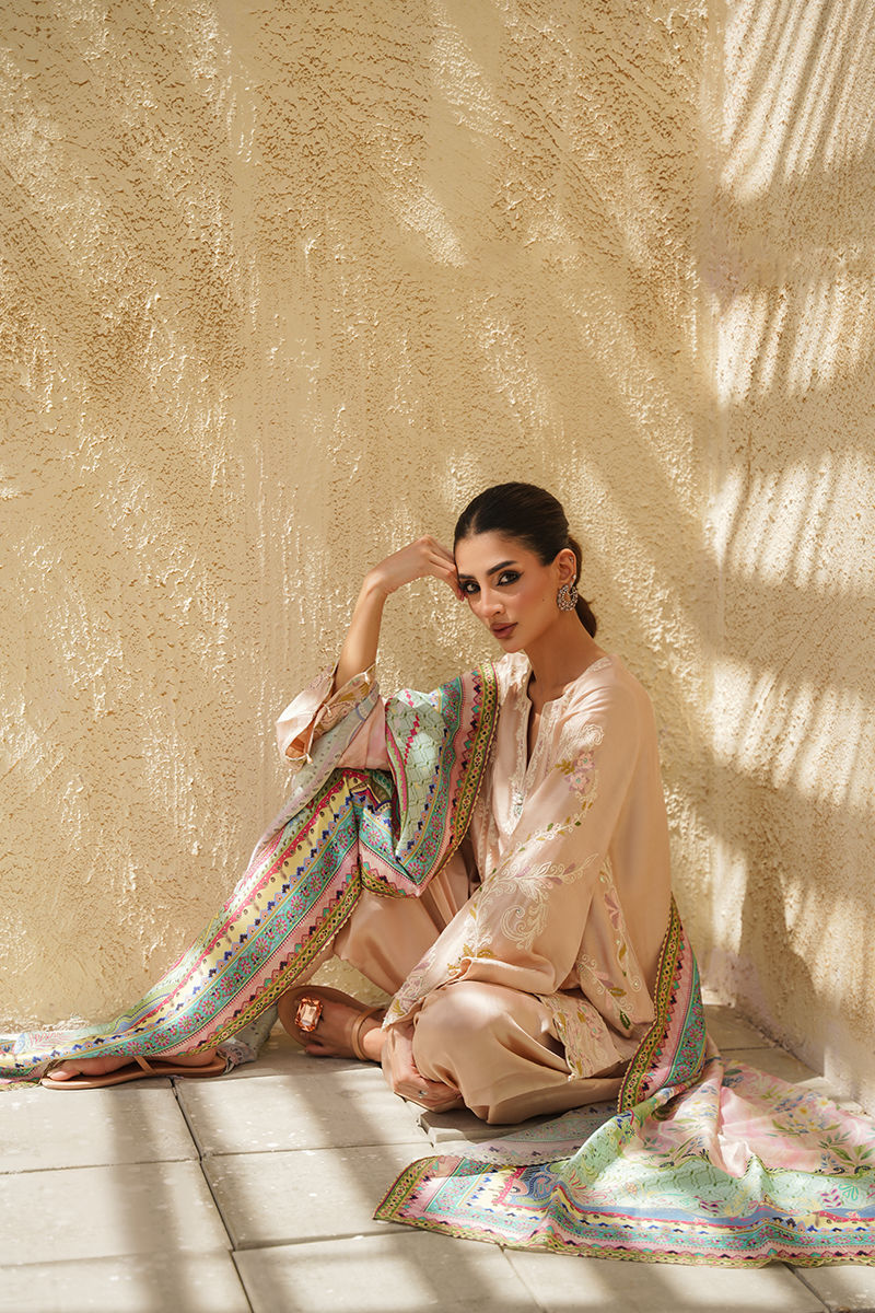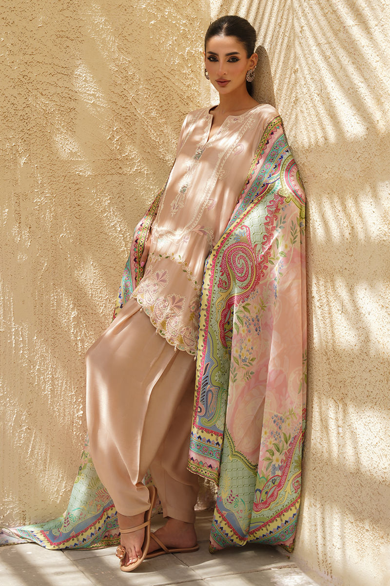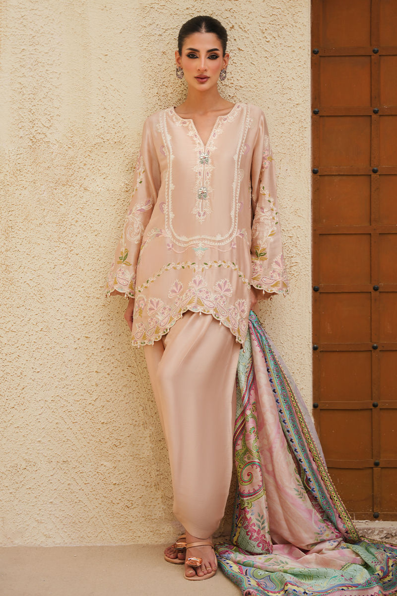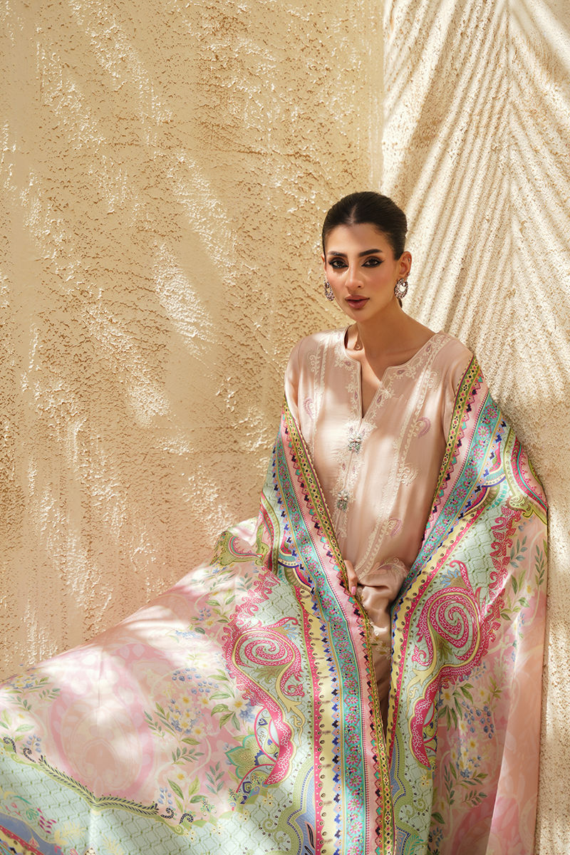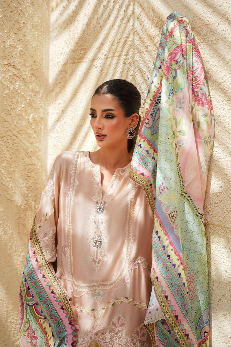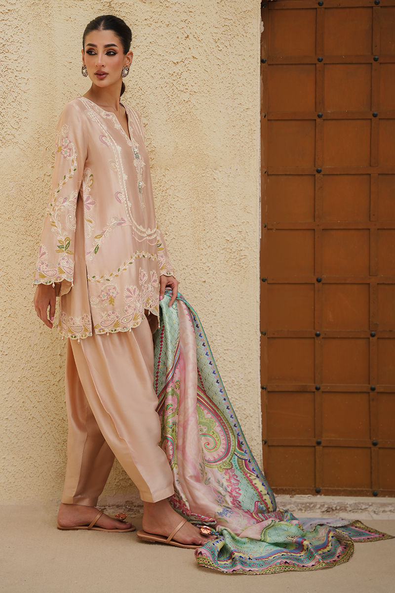 A soft pink silk shirt and shalwar set that embodies delicate elegance, featuring intricate aari embroidery enhanced with subtle Swarovski crystal work for a refined shimmer. The neckline is adorned with statement handmade buttons, adding a touch of artisanal charm. Paired with a printed crepe silk dupatta, alive with vibrant hues of pink, green, and blue, the ensemble strikes a beautiful balance between tradition and contemporary flair.