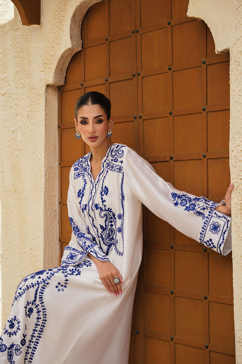 A graceful ivory silk kaftan exquisitely adorned with intricate electric blue Aari embroidery, creating a striking contrast of elegance and artistry. The fluid silhouette is elevated by detailed craftsmanship, where bold blue patterns beautifully enhance the soft ivory base. Timeless yet statement-making, this ensemble is a perfect fusion of sophistication, tradition, and contemporary charm.