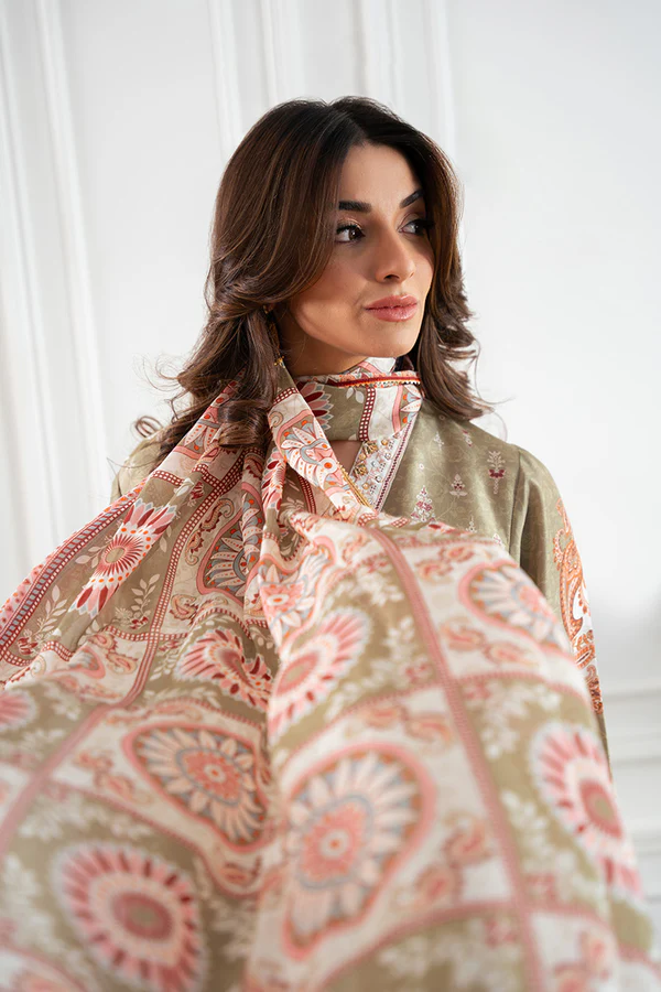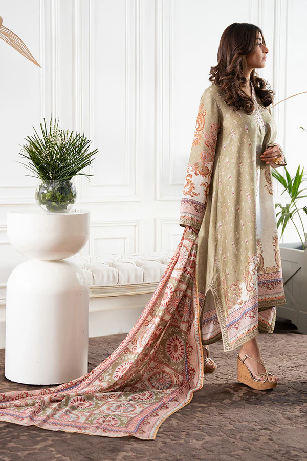 Uber chic drop down pure raw silk shirt on our in-house ivory and sage green endorsing mature floral print. Neckline is fully hand worked and the handcrafted buttons adds that oomph. Embroidery on chaak, daaman and sleeves ties everything up. Tissue Dupatta catches the attention with boxy printed elements and finished off with kingri Gota. Pants are on pure raw silk.
