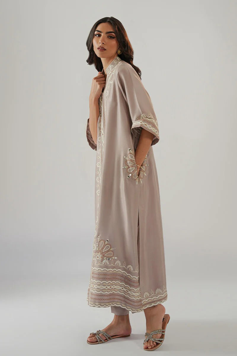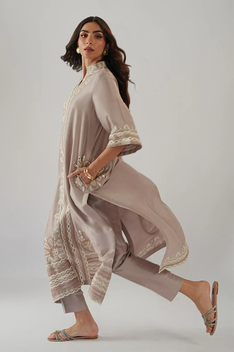 We know our AARI game!! Radiate timeless sophistication with this beige raw silk kurta, delicately embellished with intricate aari embroidery. The fine, lustrous fabric adds a subtle sheen, while the beautiful, handcrafted embroidery in rich threadwork creates a stunning visual effect along the neckline and hemline. The kurta’s elegant straight cut offers a flattering silhouette, perfect for both formal and festive occasions. Paired with matching straight pants, this ensemble exudes refined grace and effortless style. Whether for a special celebration or an upscale gathering, this ensemble is the epitome of luxury and tradition. Model height 5'10. Maximum shirt length 50"