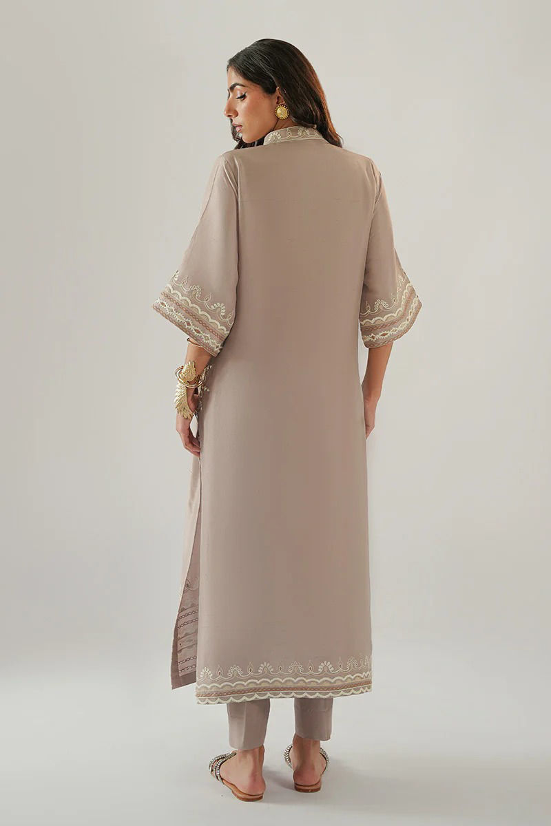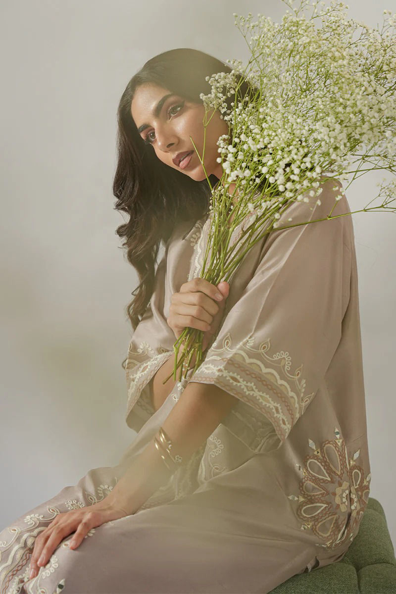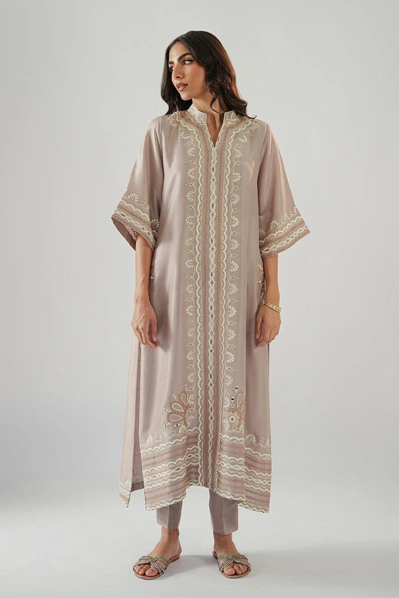 We know our AARI game!! Radiate timeless sophistication with this beige raw silk kurta, delicately embellished with intricate aari embroidery. The fine, lustrous fabric adds a subtle sheen, while the beautiful, handcrafted embroidery in rich threadwork creates a stunning visual effect along the neckline and hemline. The kurta’s elegant straight cut offers a flattering silhouette, perfect for both formal and festive occasions. Paired with matching straight pants, this ensemble exudes refined grace and effortless style. Whether for a special celebration or an upscale gathering, this ensemble is the epitome of luxury and tradition. Model height 5'10. Maximum shirt length 50" Shirt: Pure Rawsilk Pant: Pure Rawsilk